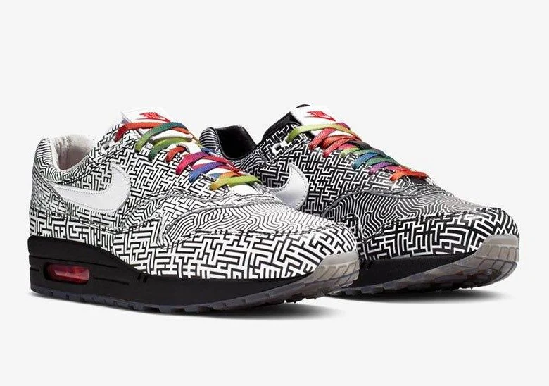 Le coloriage de l’Air Max 1 de Yuta Takuman, qui représente Tokyo, est très accrocheur. Il présente des graphismes labyrinthiques en noir et blanc sur la partie supérieure en cuir, inspirés du design labyrinthique de Tokyo et de sa population dense. Les lacets teintés ajoutent une touche de couleur, tandis que les languettes détachables « Tokyo Maze » ajoutent une autre touche unique. Le texte « Tokyo Maze » est également visible sous la semelle extérieure gris fumé translucide. La Nike Air Max 1 « Tokyo Maze » de la collection « On Air » est sortie le 13 avril 2019.