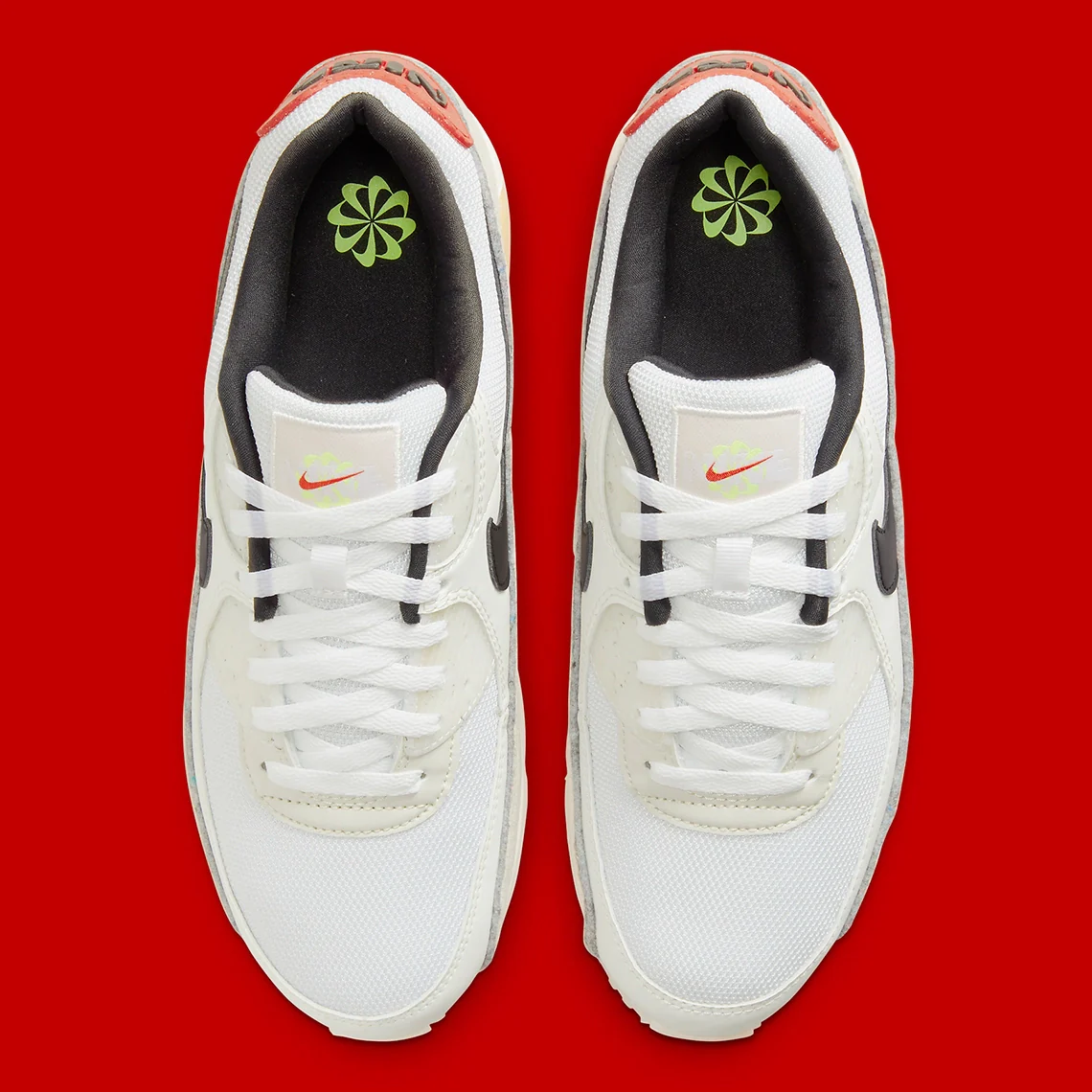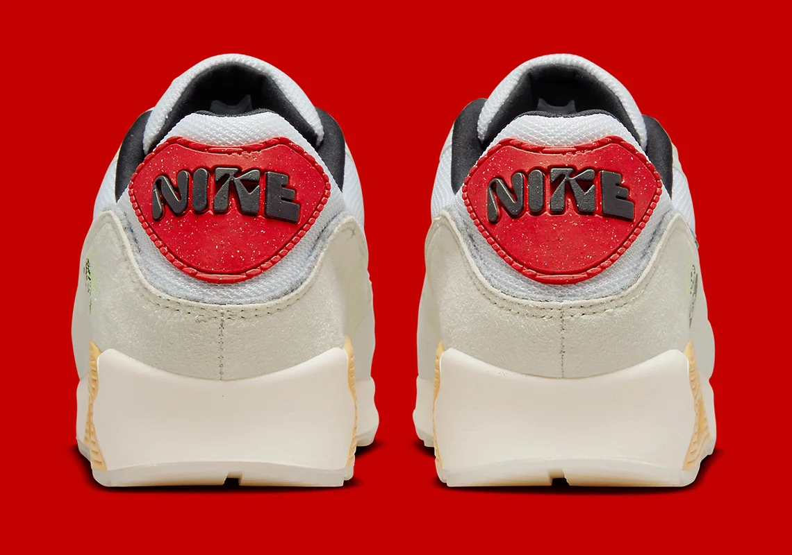 Les modèles de chaussures préférés, comme la Air Max 90, sont décorés d’une iconographie que l’on peut qualifier de thématique ovni rétro. Partageant des éléments similaires à la collection « Area 72 » qui a été lancée lors du All-Star Weekend en 2013, ce dernier design se concentre fortement sur le placement des logos, avec le logo classique pinwheel (un réseau circulaire de carreaux Swoosh) posé au-dessus du tag NIKE sur la langue et le « 90 » stylisé sur le garde-boue. De plus, Nike ajoute des semelles en caoutchouc opaque sur les deux modèles, exprimant encore plus l’énergie du thème. Les bords du garde-boue présentent également un passepoil apparent semblable au matériau que l’on trouve sur les isolants.