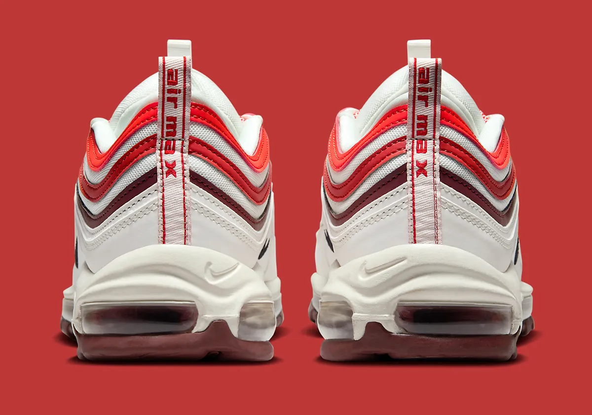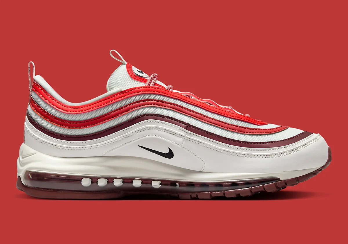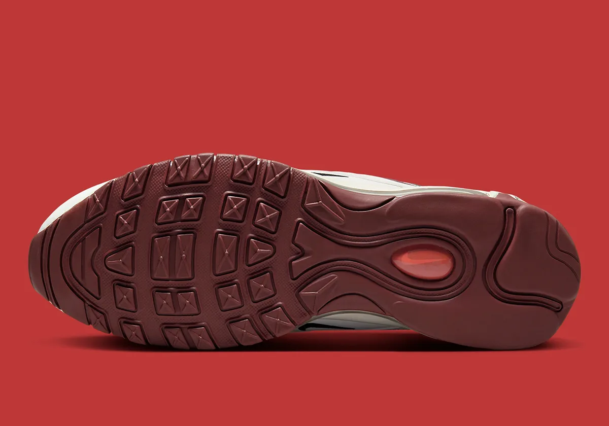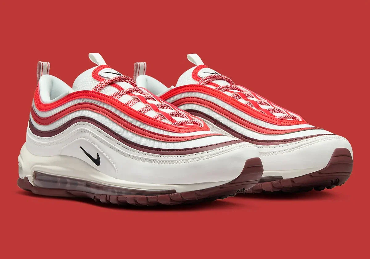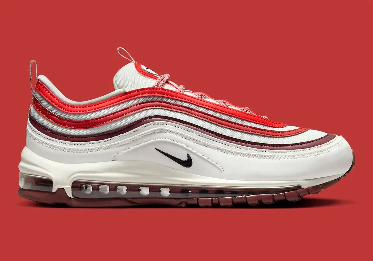 La Nike Air Max 97 Dark Team Red réinterprète la silhouette ondulée légendaire dans une palette profonde, moderne et intensément raffinée. Sa tige mêle un mesh Dark Team Red sombre et riche à des superpositions en synthetique satinéqui accentuent les courbes iconiques du modèle. Les bandes réfléchissantes 3M parcourent la chaussure de manière fluide, apportant une touche lumineuse dès que la lumière les accroche.