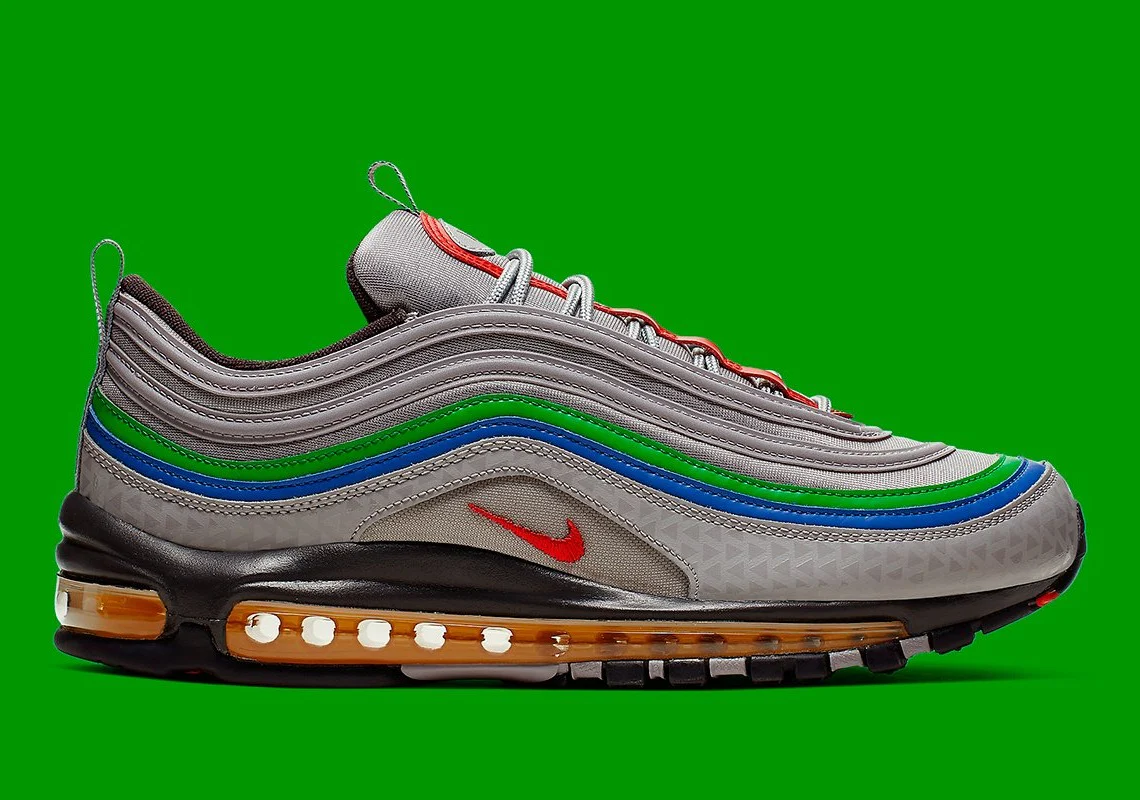 Les bases noires préparent le terrain pour le mélange de couleurs trouvé à travers les superpositions de vamp. Des nuances de bleu, de rouge et de violet apportent du flair à la paire tonale dans un arrangement qui rappelle l’ Air Max 97 Neon Seoul. Les languettes en mesh reposent sous les lacets noirs avec des détails réfléchissants et sont ornées d’une bande vert fluo.