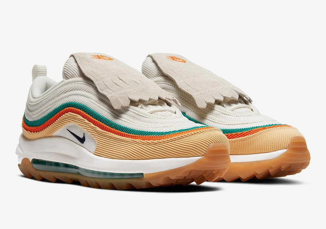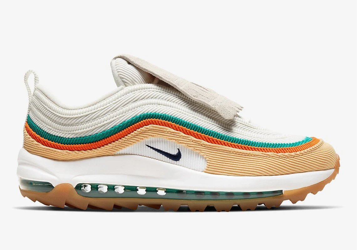Depuis des années maintenant, Nike a tenté de mélanger streetwear et golf, renversant le script sur de nombreux classiques pour mieux les préparer au green. Parmi ces expérimentations, la Air Max 97 est peut-être la plus fréquentée, elle est bientôt prête à s’appuyer davantage sur ses inspirations avec une construction en velours côtelé, un kiltie en daim et un coloris ludique.