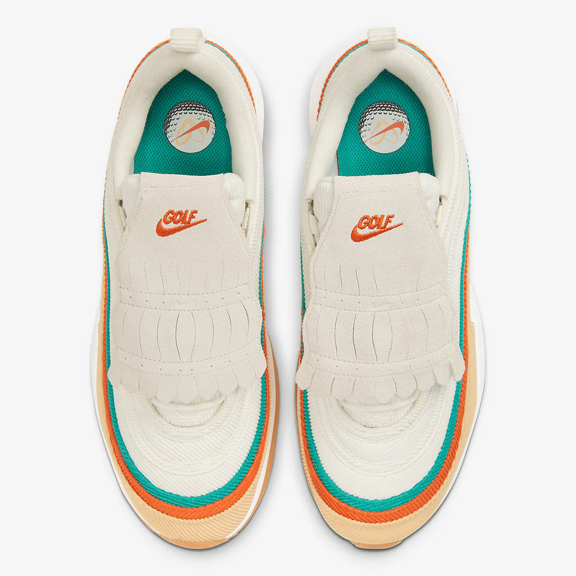 Du bas, la tige mène avec une teinte beige foncé et une semelle en gomme aux performances améliorées. Des touches plus vives d’orange et de vert s’habillent ensuite juste au-dessus, en passant de la pointe au talon en parallèle à la fois à ce qui précède ainsi qu’au cordon blanc qui habille la majorité de la chaussure. Le kiltie en daim, la traction du talon, la doublure et la semelle intercalaire emboîtent le pas, tandis que la marque (à part la balle de golf géante à l’intérieur) transforme ses swoosh en un ton chaud et fort. A noter également que le kiltie est entièrement amovible.