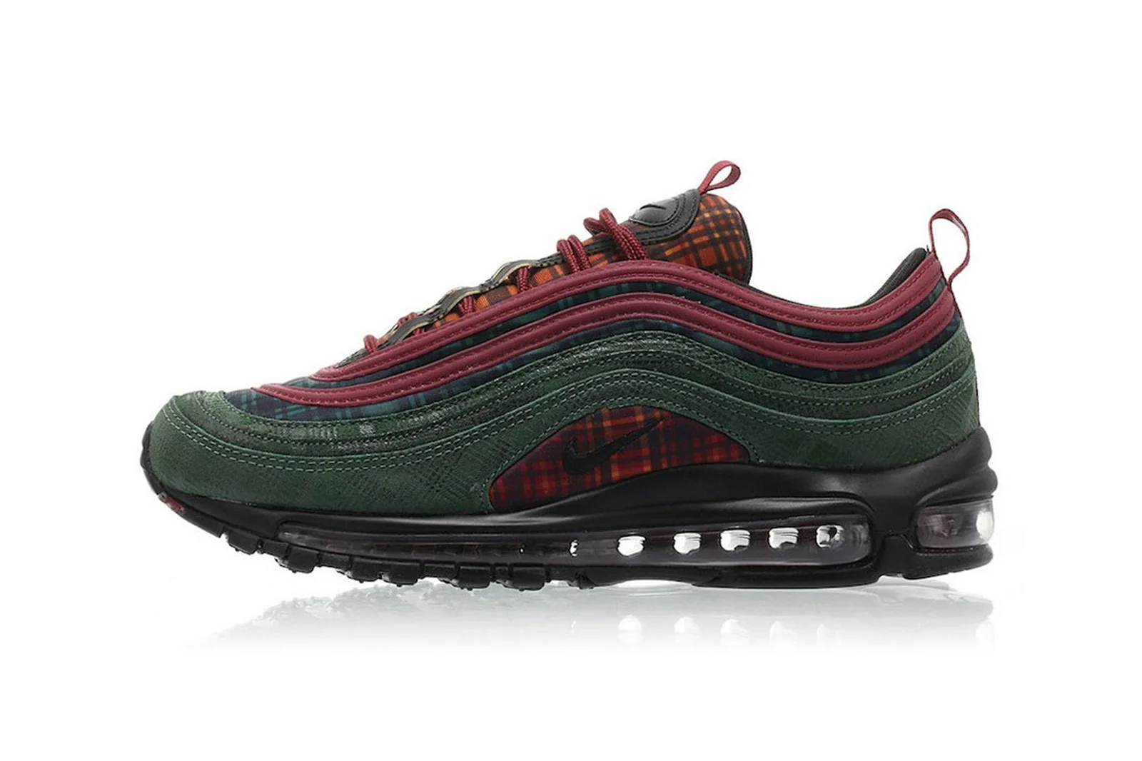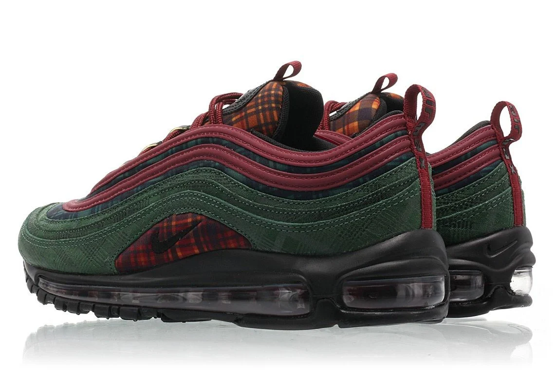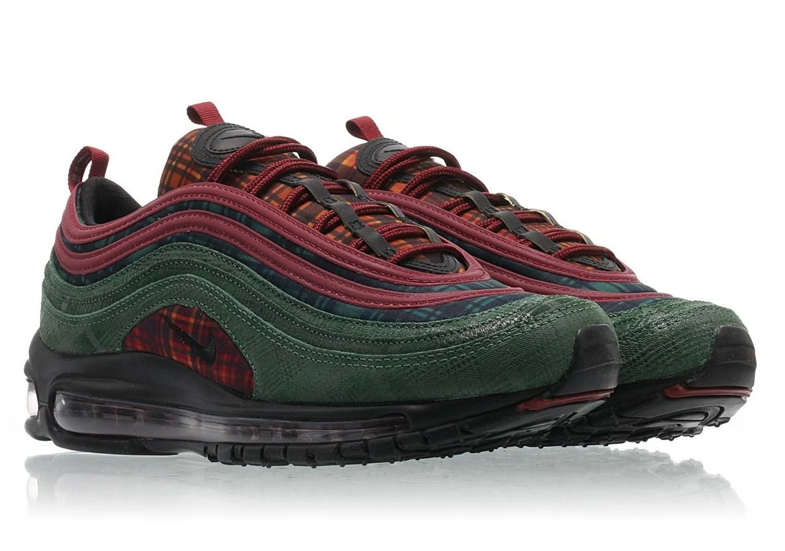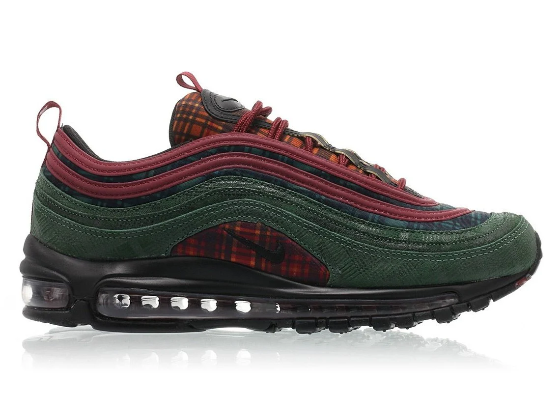 La « Jacket Pack » Nike Air Max 97 NRG reprend le design original avec des tons, des textures et des imprimés inspirés des vêtements d’hiver. Cette basket, sortie en novembre 2018, comporte des panneaux à carreaux au niveau de la langue et du milieu du pied. Le jeu de couleurs unique de cette chaussure est souligné par des lacets et des tirettes rouges, ainsi qu’un garde-boue en cuir nubuck moulé dans du Midnight Spruce. Cette chaussure NRG haut de gamme est finie avec une unité Max Air visible sur toute la longueur pour une réactivité légère.
