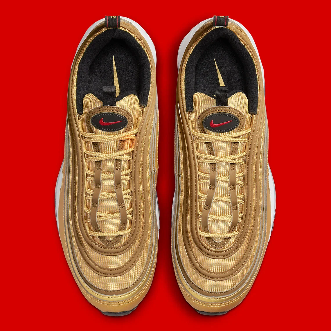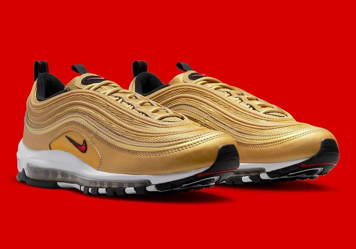 Le 20e anniversaire de la Nike Air Max 97, la chaussure conçue par Christian Tresser, inspirée du train à grande vitesse japonais Bullet, fait revenir le classique dans des couleurs familières. Cela inclut ce superbe rétro de 2017 de la couleur « Metallic Gold ». La tige est construite avec une combinaison de cuir et de mailles, qui apparaissent toutes deux en or. Les détails réfléchissants 3M ajoutent une dynamique supplémentaire à l’apparence.