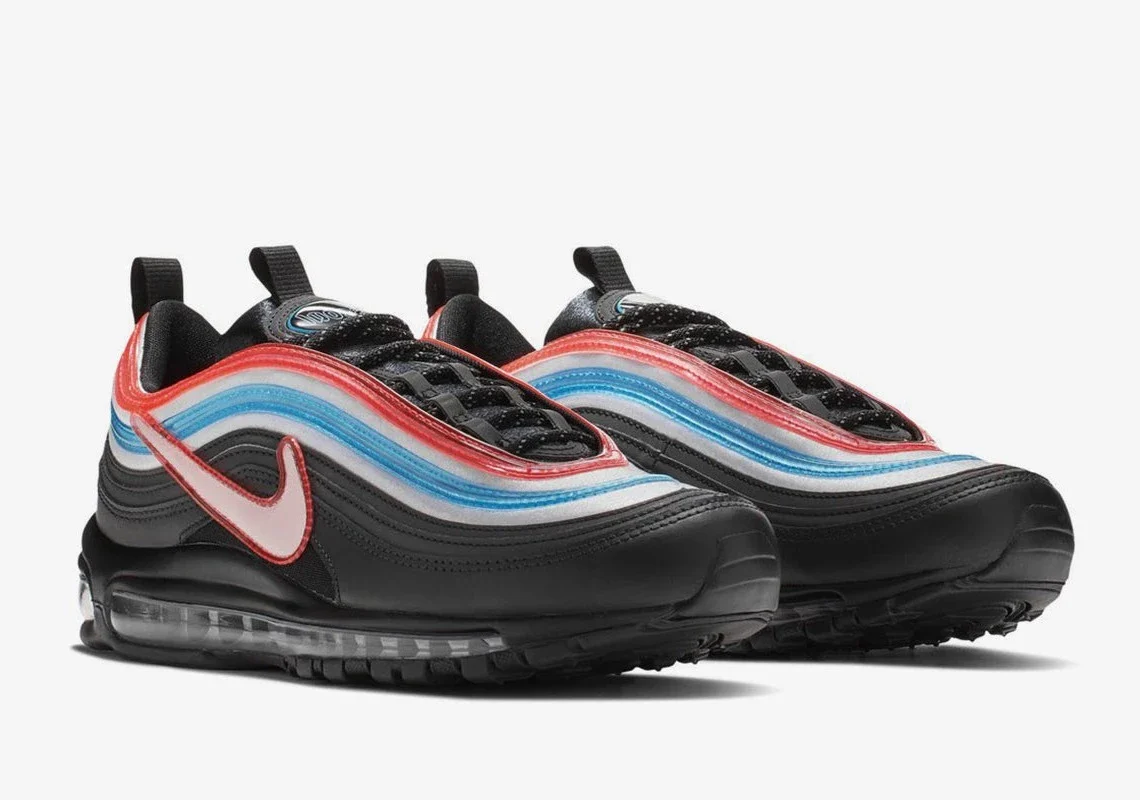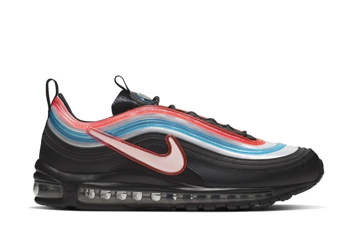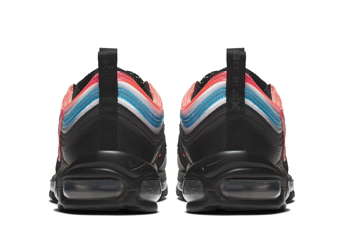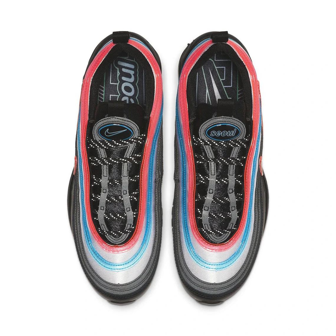 Le coloris et la construction uniques s’inspirent des grandes enseignes au néon de la ville, des couleurs contrastées du drapeau sud-coréen et du symbole de Taeguk qui représente l’équilibre universel. Les panneaux noirs prédominants de la partie supérieure représentent le ciel nocturne de Séoul, avec les rayures rouges et bleues translucides et le Swoosh surdimensionné qui imitent l’aspect des enseignes au néon. La Nike Air Max 97 « Seoul » de la collection On Air est sortie le 13 avril 2019.