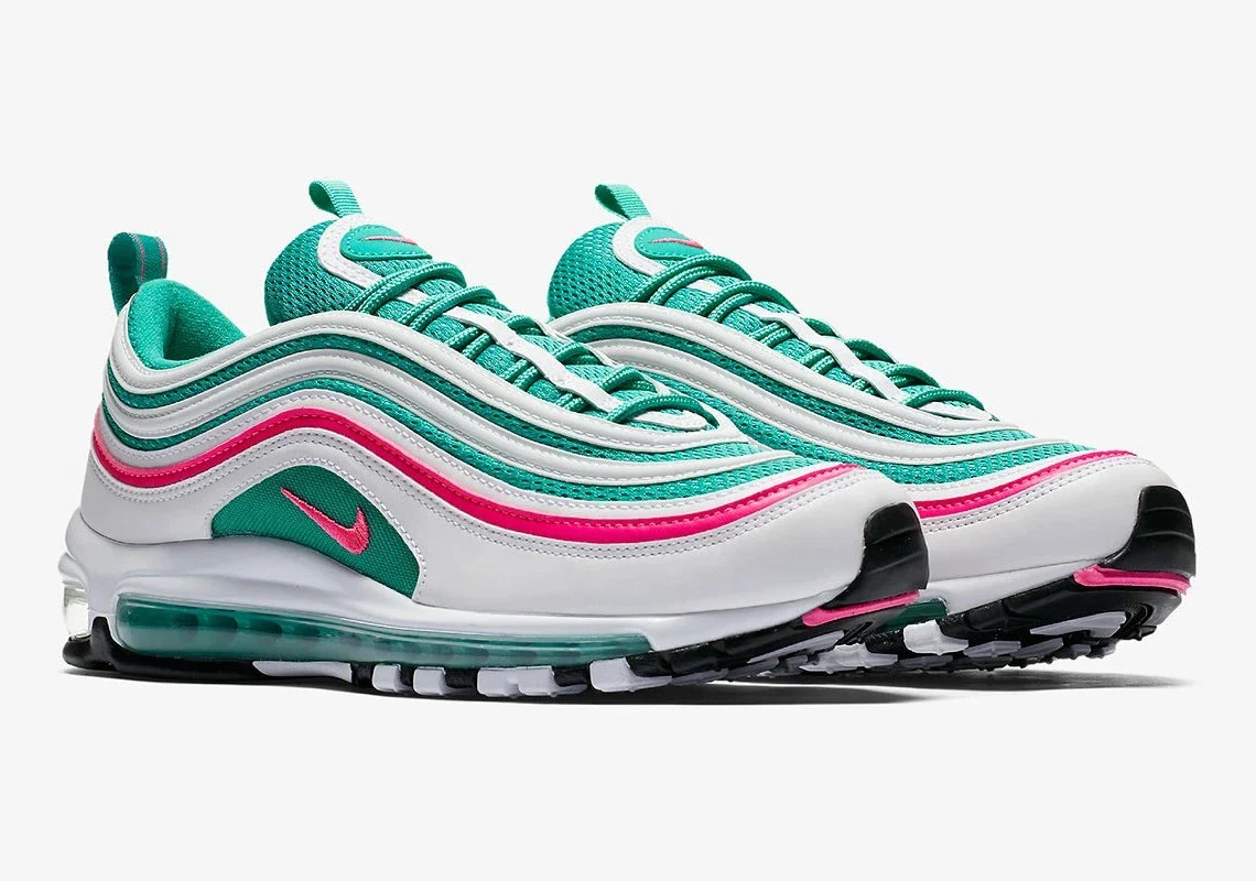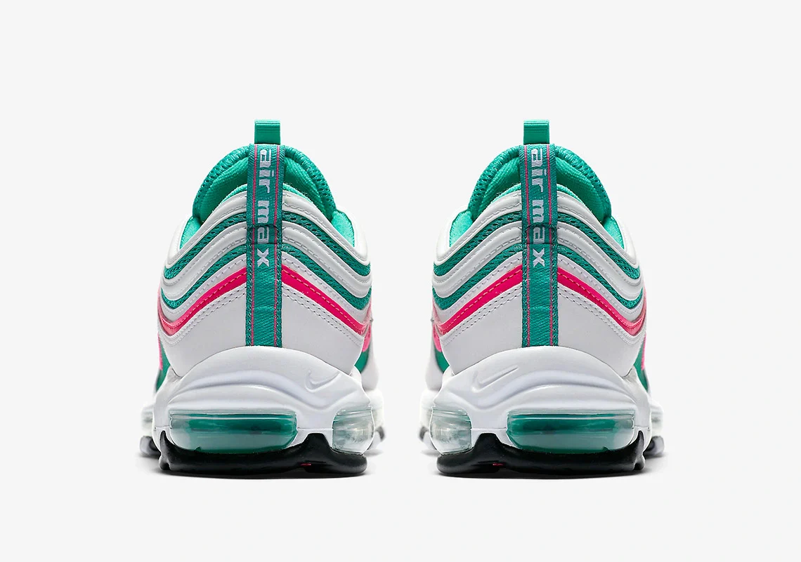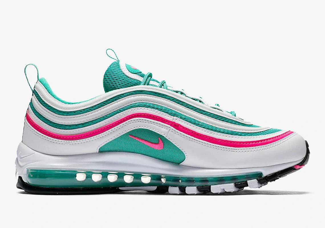 L’Air Max 97 « South Beach » emprunte ses couleurs à l’architecture art déco qui orne le quartier de Miami du même nom. Le dessus en maille Kinetic Green est accentué par des superpositions de cuir ondulé blanc et Pink Blast. Et sous le pied se trouve une semelle Air sur toute la longueur pour un amorti léger.