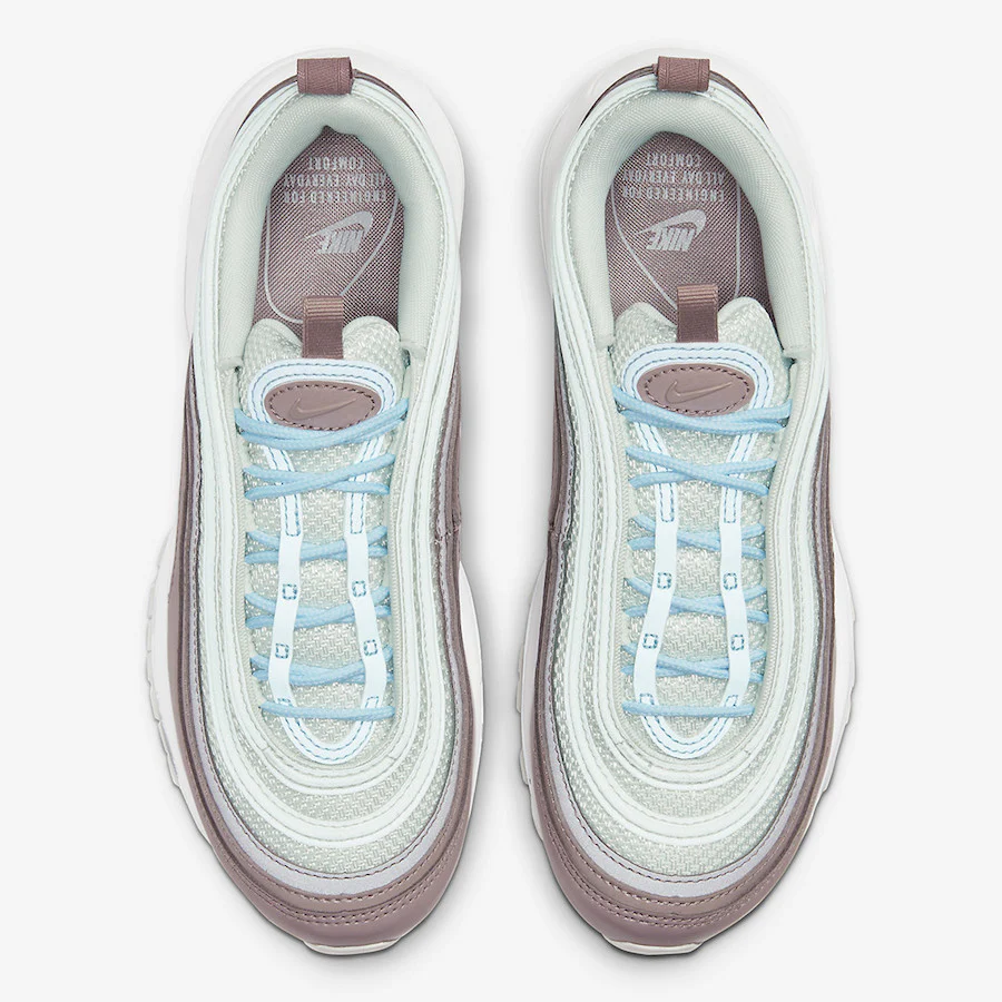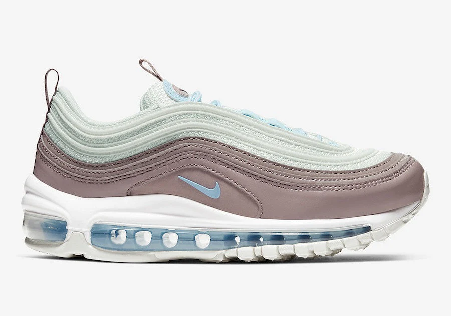 Habillée d’une combinaison de couleurs Spruce Aura, Celestine Blue et Pumice White. Cette Nike Air Max 97 présente une tige en mesh blanc avec des superpositions en cuir, soulignées par des accents bleu clair sur les languettes, les lacets, les logos Swoosh et les unités d’air. Une semelle intermédiaire blanche sur une semelle extérieure en caoutchouc blanc cassé complète le design.
