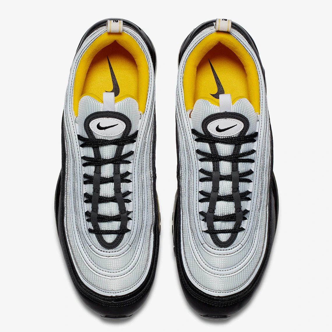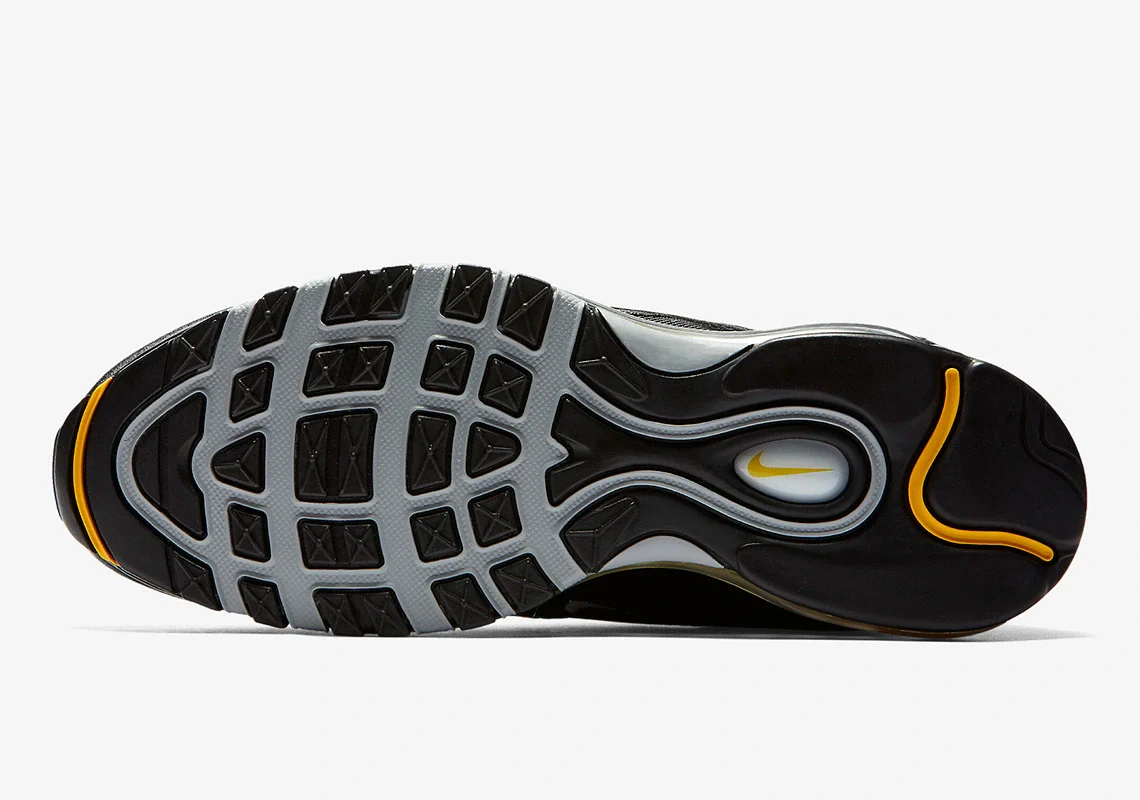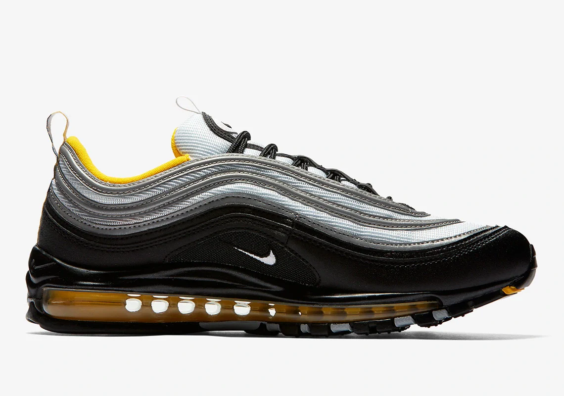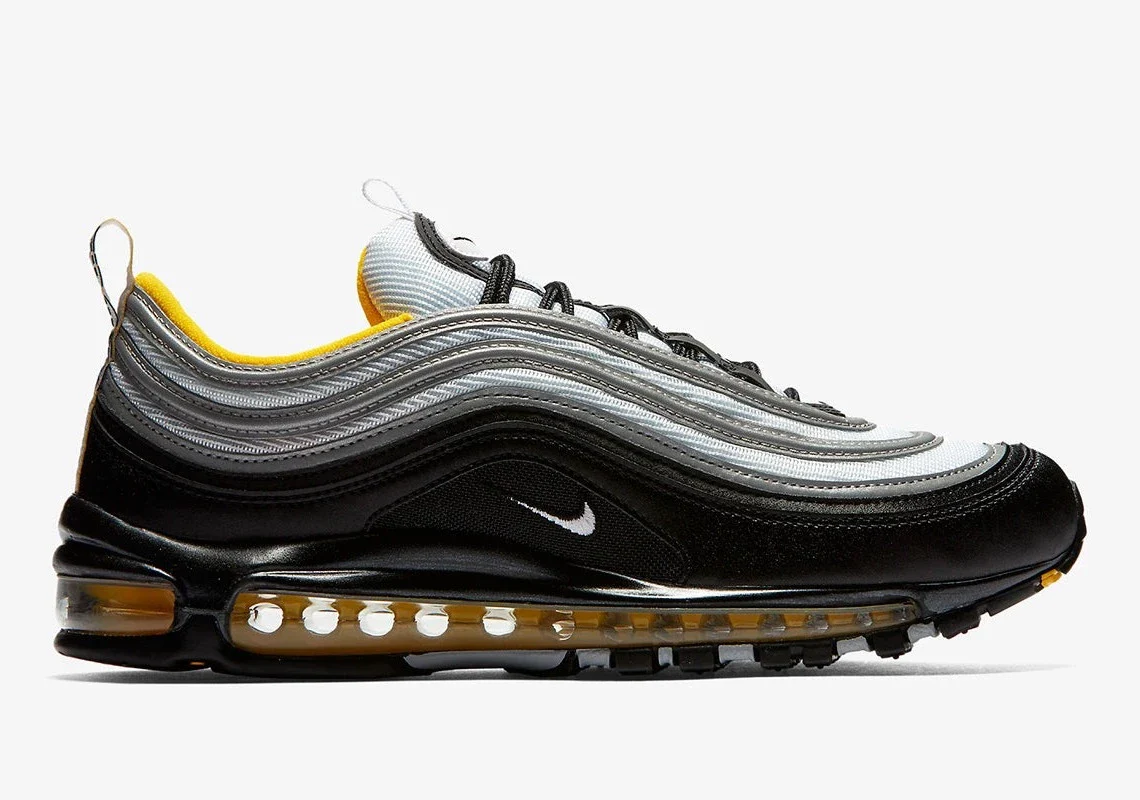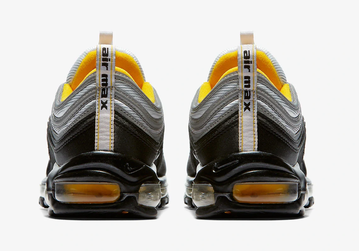 L’Air Max 97 « Steelers » adopte un schéma de couleurs familier qui rappelle la franchise NFL de Pittsburgh. La partie supérieure est construite avec un mélange traditionnel de maille et de cuir, divisé en gris clair sur la moitié supérieure et en noir de base sur la moitié inférieure. La doublure du col et l’unité Max Air sur toute la longueur sont ornées de touches de jaune Amarillo, ce qui permet d’obtenir un rembourrage léger et réactif.