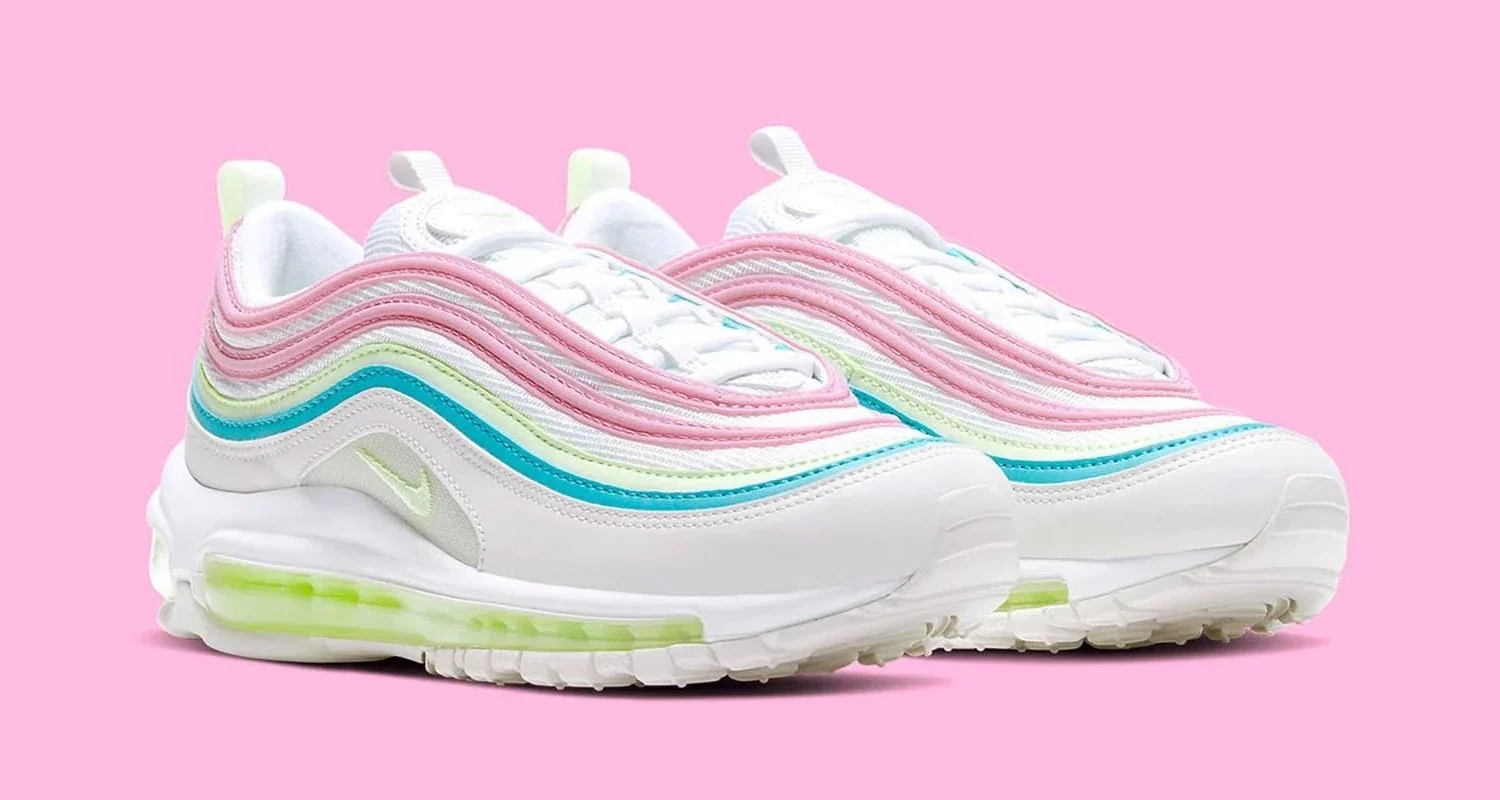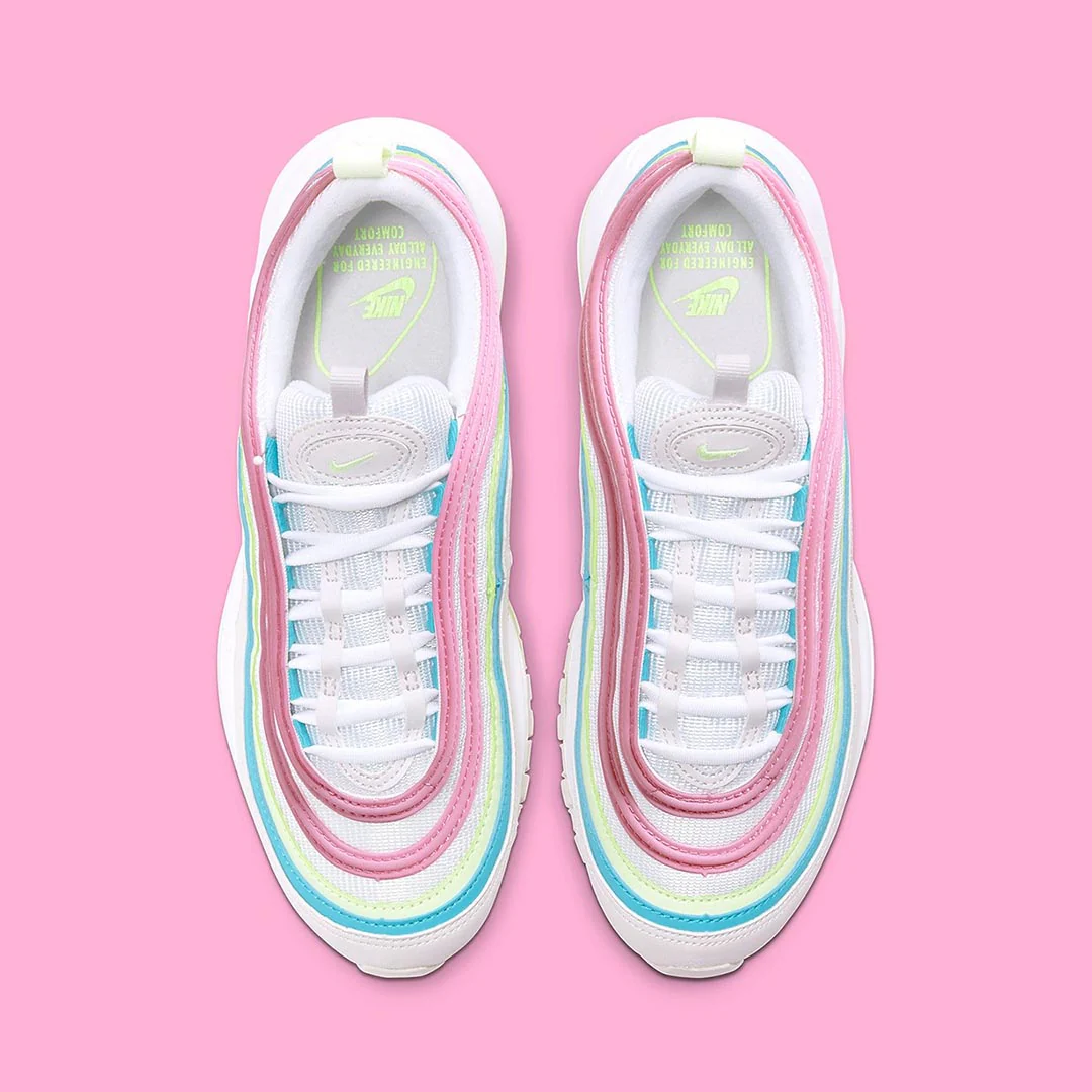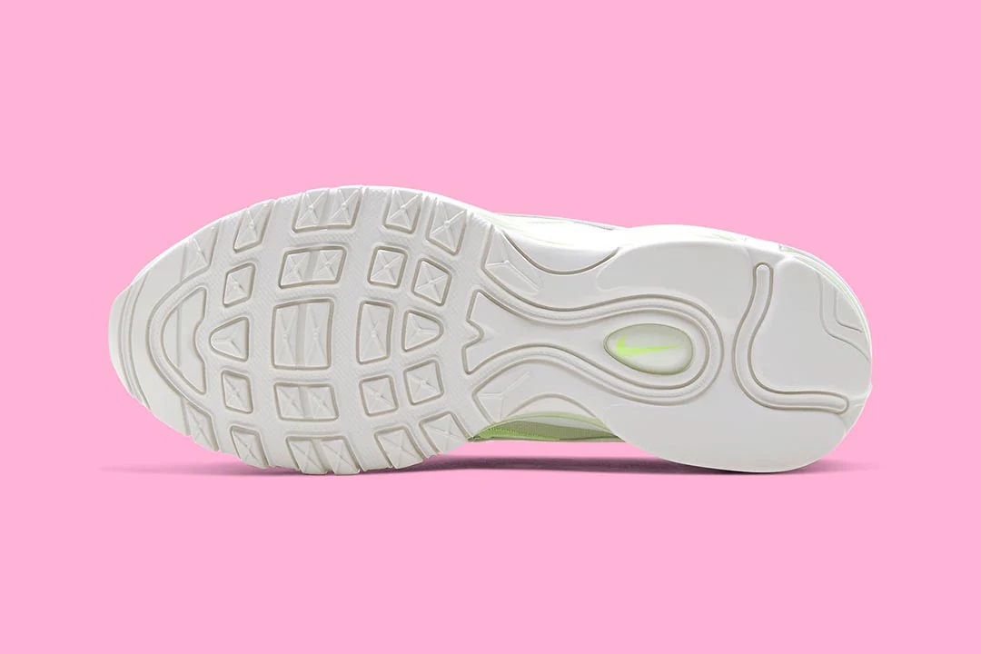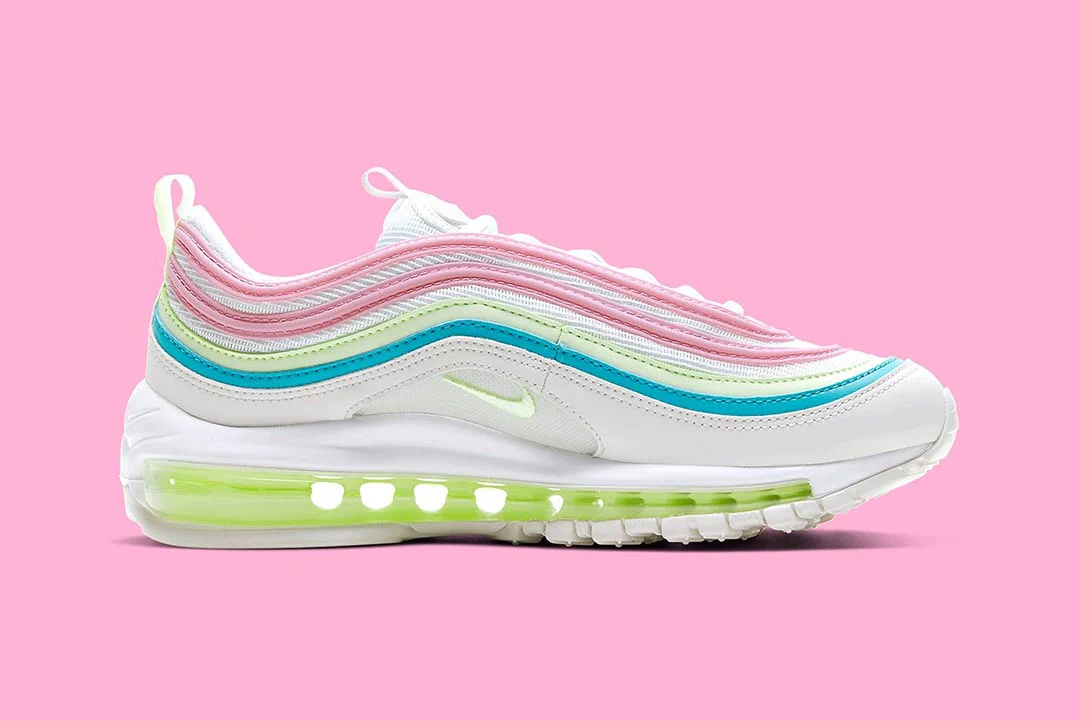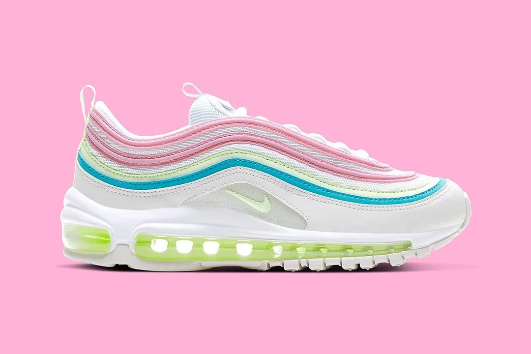 La Air Max 97 « White Barely Volt » se présente avec un look pastel adapté aux vacances de printemps. Construit avec une base en maille blanche, la partie supérieure est recouverte de cuir bleu, rose et Barely Volt, avec des boucles pour la langue et le talon pour faciliter l’installation et l’enlèvement. Des détails réfléchissants accentuent encore le look, tandis que sous le pied, une semelle intermédiaire Boost sur toute la longueur assure l’amorti.