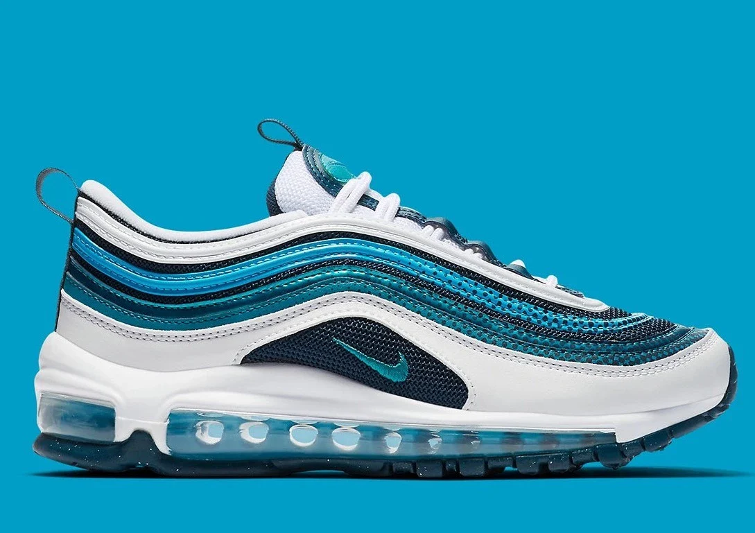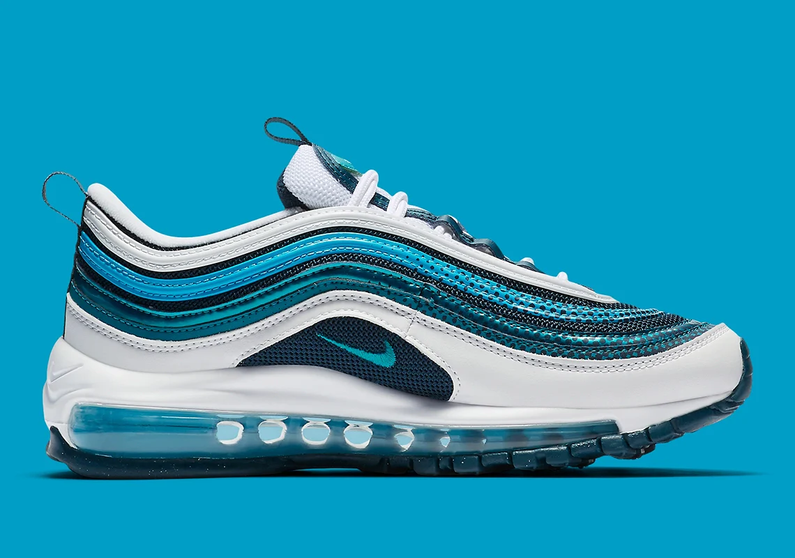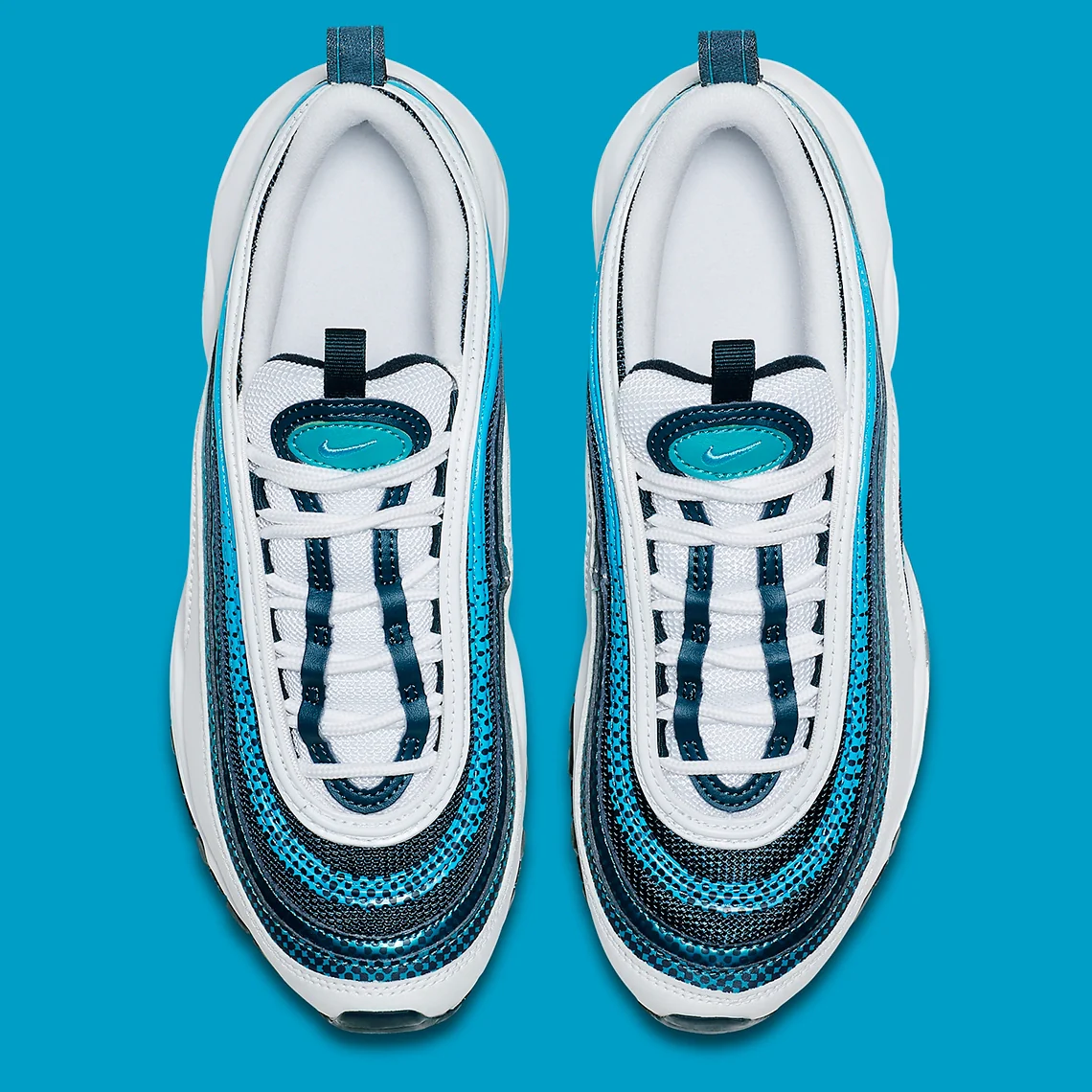 On voit également sur la tige un motif graphique géométrique plus audacieux à l’avant du pied, mais qui s’estompe vers le talon. La Nike Air Max 97 est dotée d’une semelle intermédiaire en mousse blanche avec un coussin Max Air pleine longueur en sarcelle et une semelle extérieure bleu marine.