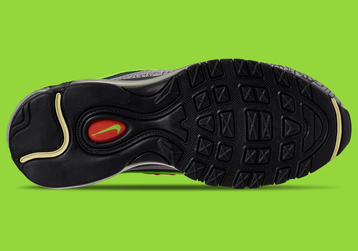 Juste au-dessus, le swoosh se dessine dans des verts visqueux, reposant juste devant une pleine lune avec des chauves-souris volant près d’à côté. Les cuirs lisses bleu marine et les synthétiques teints en noir agissent comme le ciel blanc après les heures de travail, détaillé par la marque et la sangle de ton rouge sang. La bile susmentionnée s’infiltre à travers des notes plus apparentes à mesure que sa bulle d’air brille d’un effet radioactif, correspondant à celle des lacets et des passepoils qui portent un effet néon de la pointe à l’arrière.
