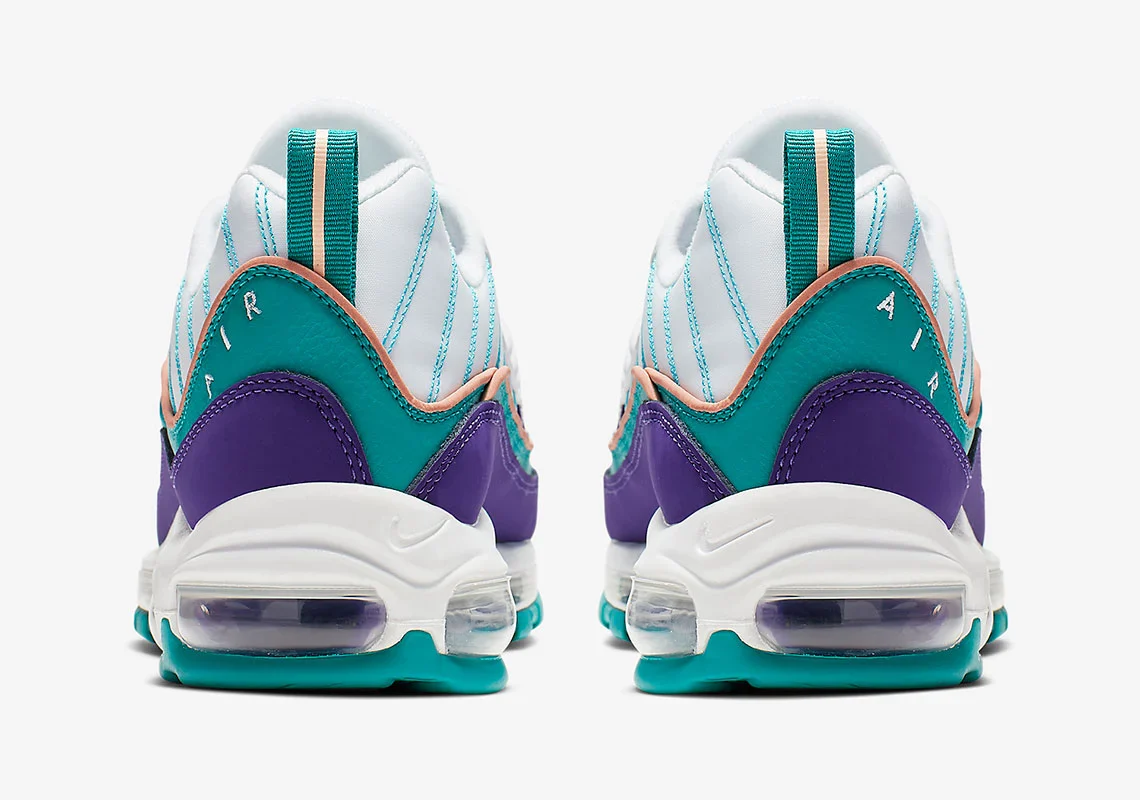 La chaussure de 1998 arbore une tige en cuir blanc, du cuir tumbled sarcelle sur le panneau latéral et du nubuck violet sur le garde-boue. La sarcelle et le violet sont également utilisés pour colorer les lacets, les œillets, la bulle d’air et la semelle extérieure. Un liseré marron clair sépare la tige en deux, tandis qu’un petit empiècement en cuir de basket-ball sur le bout du pied vient compléter le thème du basket-ball.