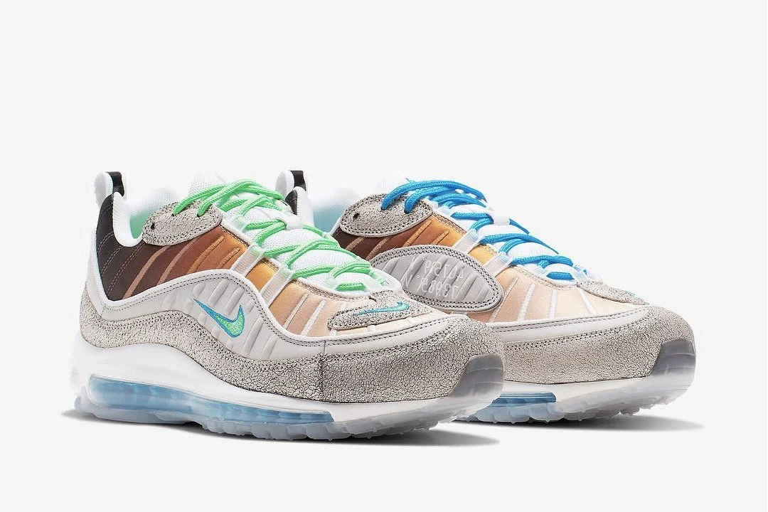 En espagnol pour « mélange« , la Air Max 98 « La Mezcla » présente un dégradé supérieur du noir au brun et au blanc, inspiré par la diversité de la ville de New York. Les couleurs représentent le spectre complet des couleurs de peau que vous trouverez dans la ville, tandis que les panneaux de cuir craquelé représentent la « jungle de béton ». Les accents verts et bleus représentent respectivement la Statue de la Liberté et l’eau qui entoure la ville. L’édition limitée Nike Air Max 98 « La Mezcla » est sortie le 13 avril 2019.