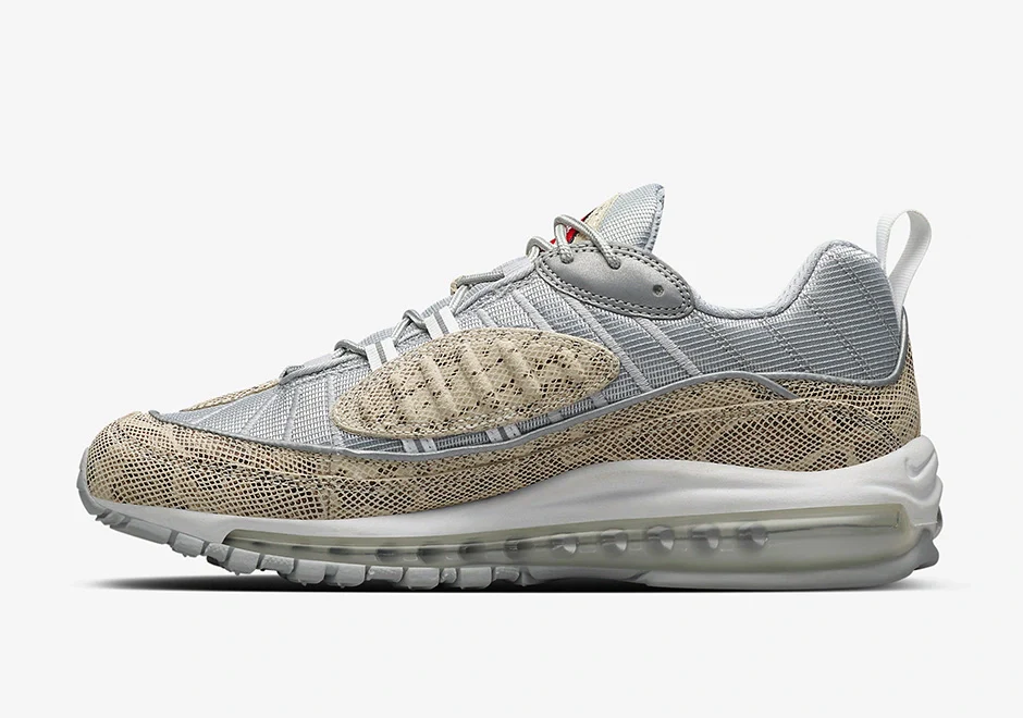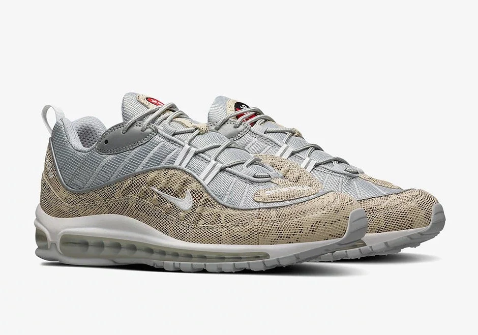 La Supreme x Air Max 98 ‘Snakeskin’ présente des détails en peau de serpent sur ses empiècements. Le reste de la chaussure est composé d’une maille argentée métallique avec un liseré réfléchissant, tandis que la languette du talon et les orteils portent la marque Supreme, avec » World Famous » sur les talons. Le Max Air sur toute la longueur de la chaussure assure l’amorti sous le pied.