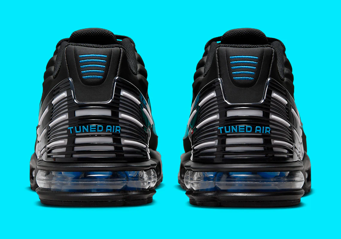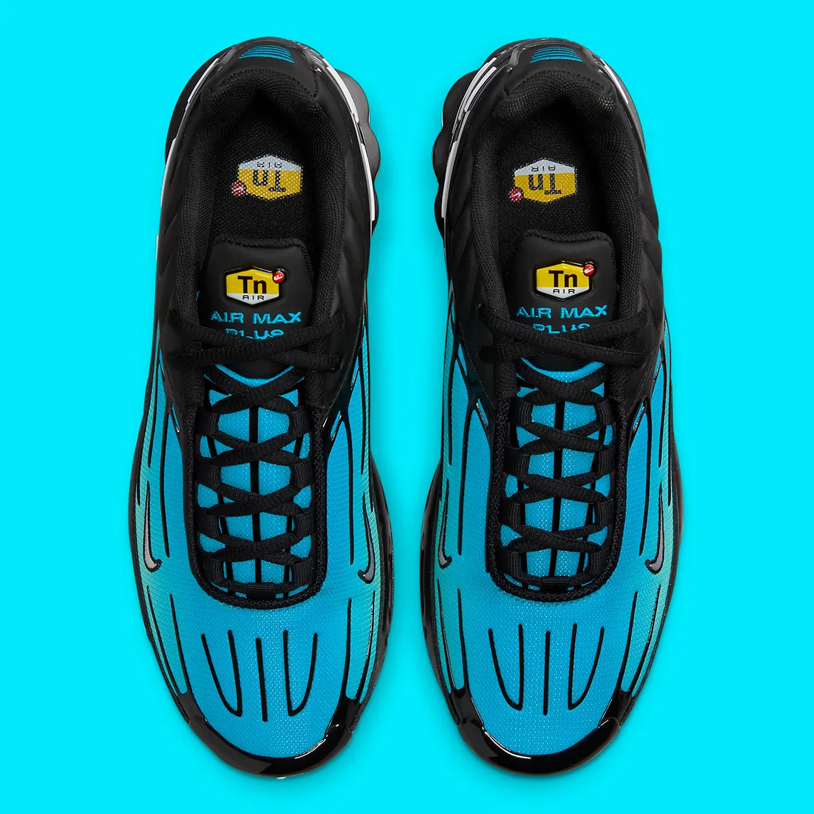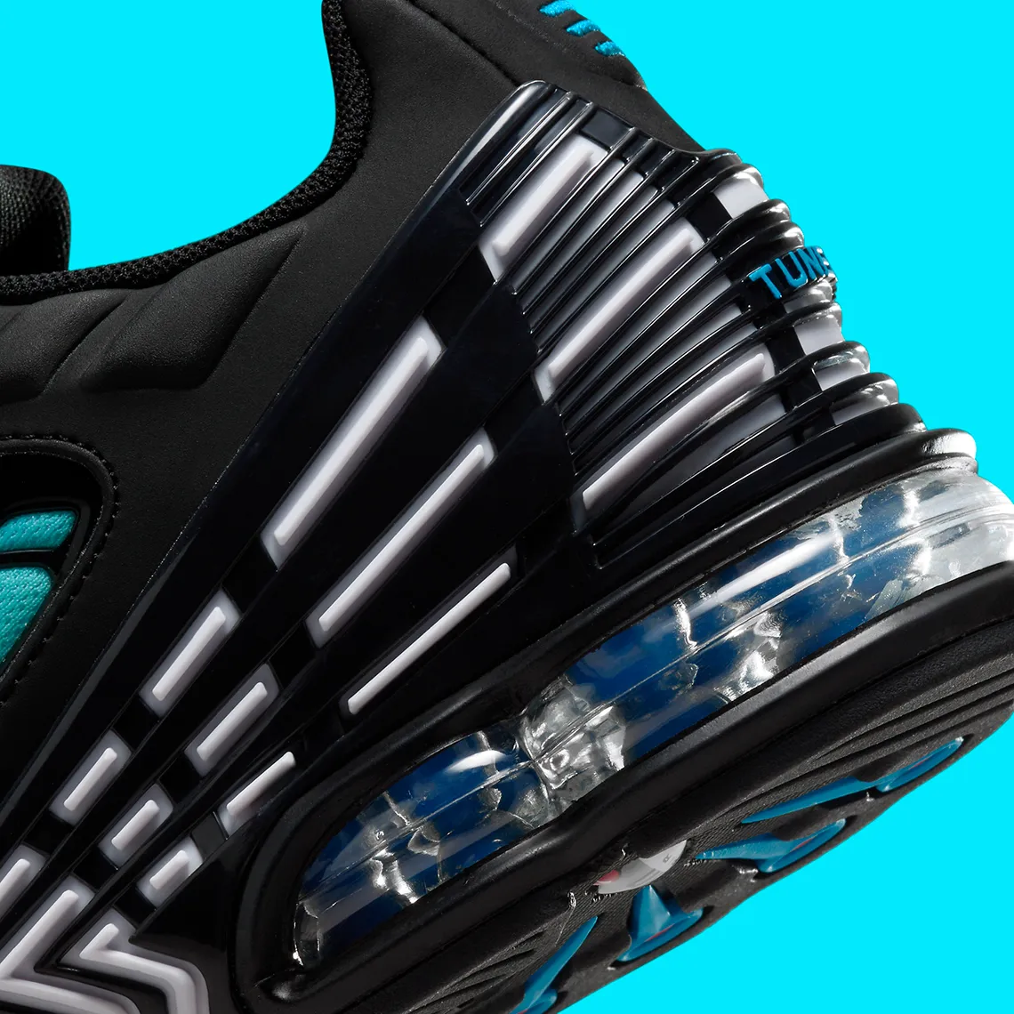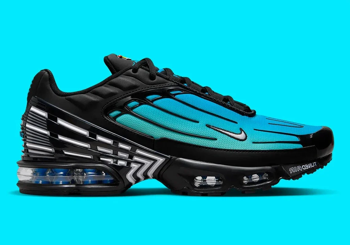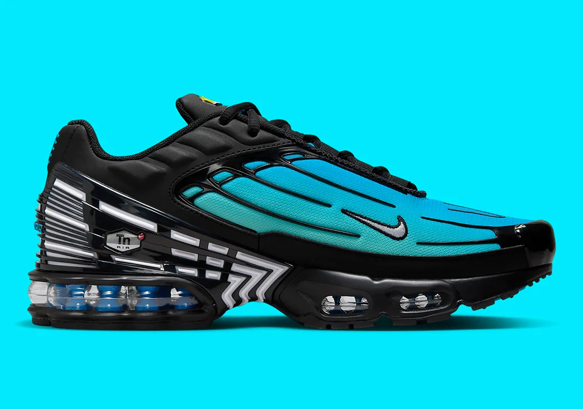 Sous le pied, la technologie Tuned Air offre un amorti ciblé et dynamique, tandis que la semelle extérieure en caoutchouc garantit une adhérence optimale. Les logos “Tn Air” et les touches argentées ajoutent une dimension premium à ce classique revisité. Véritable statement visuel, la Air Max Plus 3 Aqua Gradient capte la lumière et le regard à chaque pas — un must-have pour les amateurs de sneakers iconiques et de colorways audacieux.