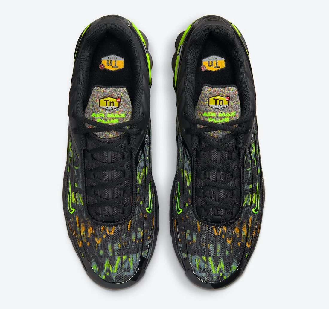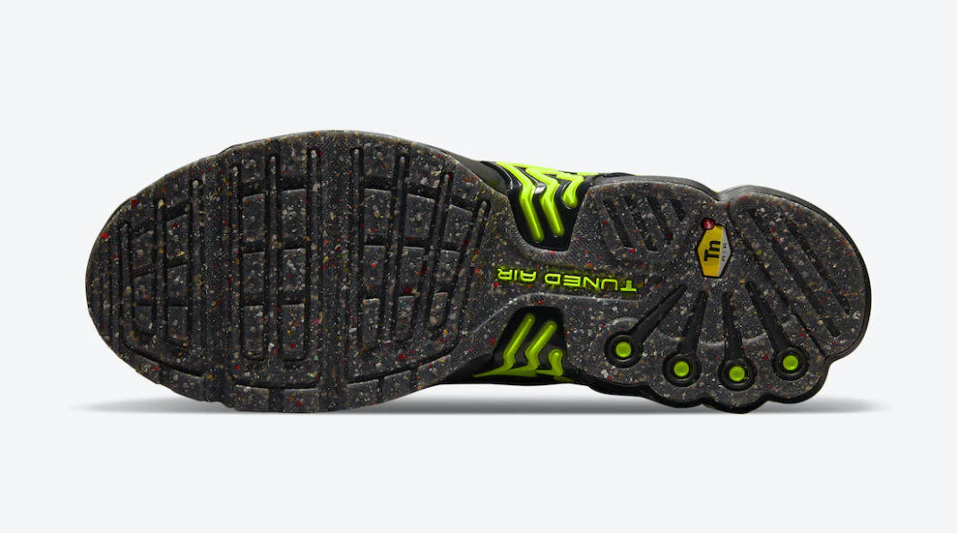 Ce n’est pas la première fois qu’une Air Max Plus reçoit une apparence verte, en janvier dernier, la OG arborait une tige en tissu recyclé et une semelle extérieure en mousse Crater. En utilisant la troisième TN, Nike a décidé d’assassiner l’itération, avant d’ajouter une sorte de motif glitch sur la tige. Les accents verts font vraiment ressortir les couleurs, avec le caoutchouc Nike Grind qui orne la semelle extérieure et le bout de la languette.