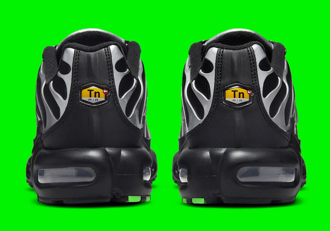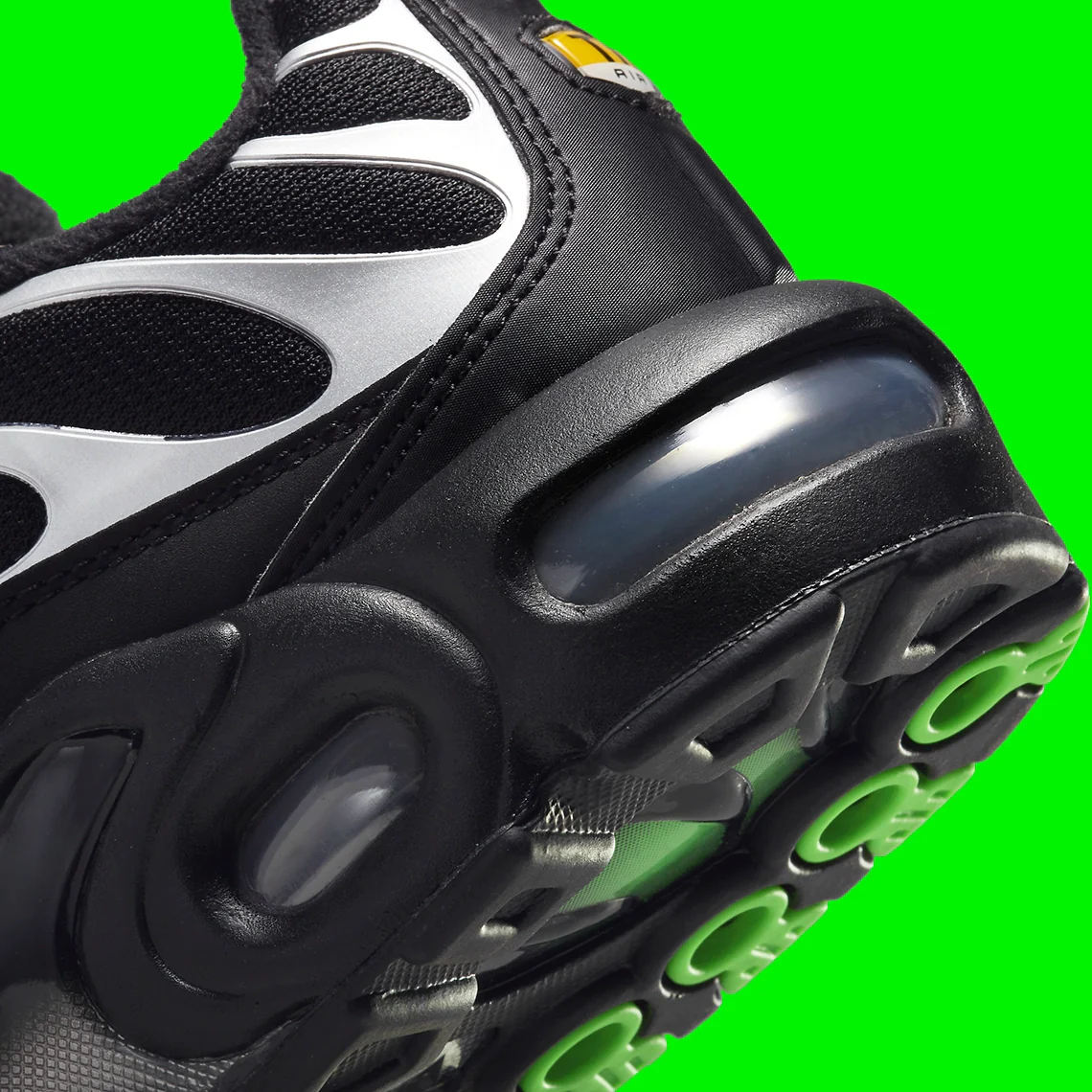 La Nike Air Max Plus Black Silver Green Strike revisite la silhouette emblématique de la TN avec un coloris à la fois sombre, métallique et dynamique. Sa tige en mesh noir profond offre une base élégante, hautement contrastée par des “vagues” d’argent métallisé (Metallic Silver) qui évoquent l’esthétique fluide de l’exosquelette de la TN. Les touches Green Strike, présentes sur le Swoosh, la semelle extérieure et le logo “Tn Air”, apportent une note vive, presque électrique, qui dynamise l’ensemble.