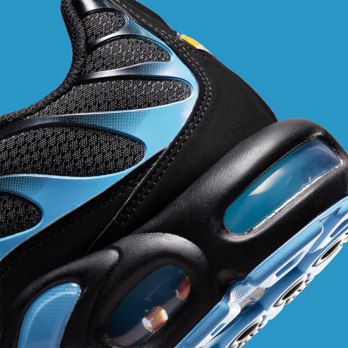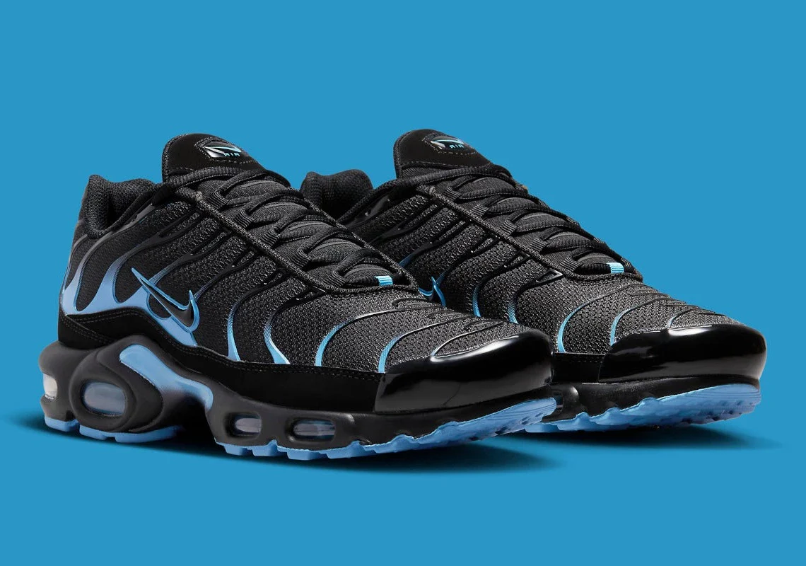 La Nike Air Max Plus Black University Blue (2022) revisite l’iconique “Tn” avec une palette contrastée et percutante, parfaite fusion entre esthétique street et performance technique. Sa tige en mesh noir profond est sublimée par des dégradés de bleu “University Blue” sur les cages TPU ondulées, signature du modèle depuis 1998. Les accents bleu clair sur le swoosh, les œillets et la semelle ajoutent une touche vibrante à cette silhouette nocturne et racée.