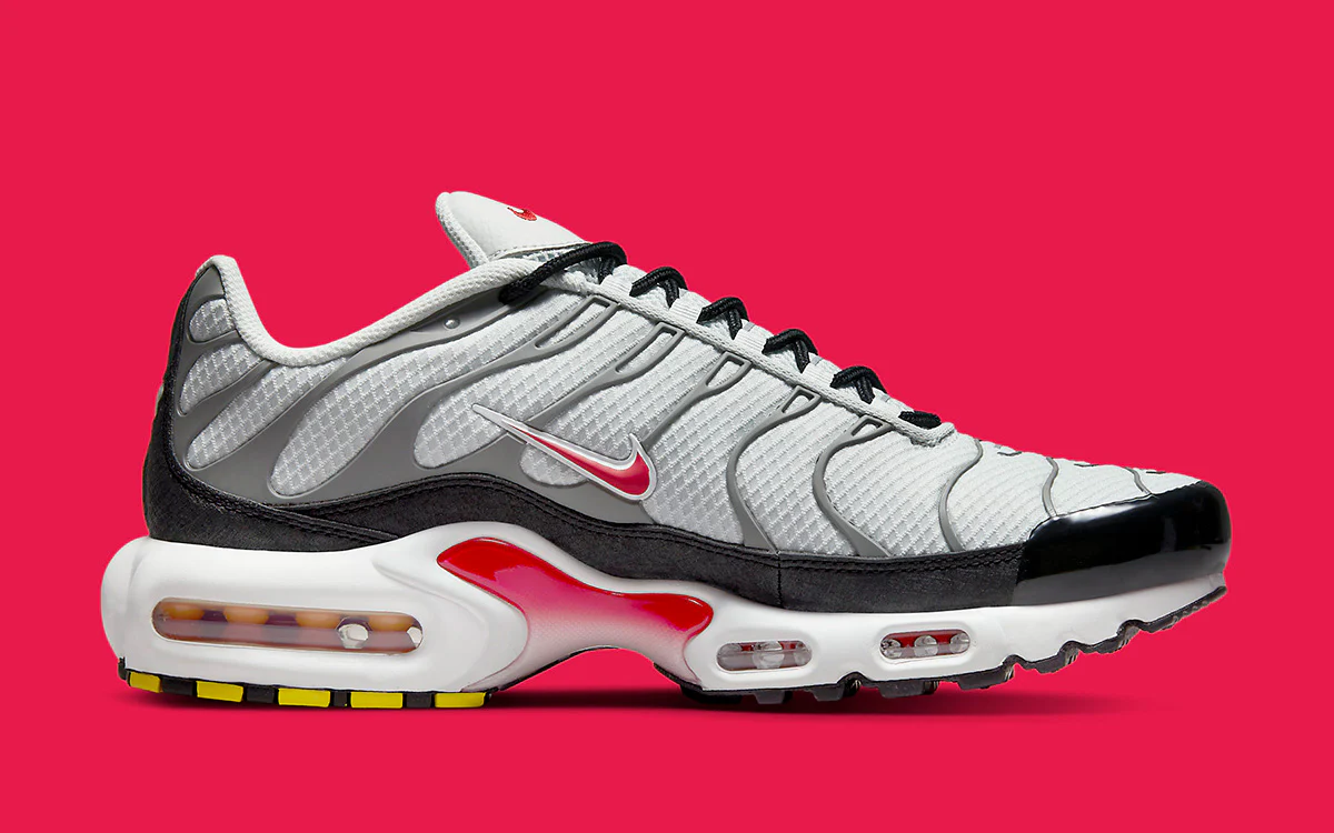 La Nike Air Max Plus Photon Dust Varsity Red s’impose comme une version raffinée et audacieuse de l’emblématique TN. Sa tige en mesh « Photon Dust/Particle Grey », subtilement nuancée entre gris clair et acier, crée une toile élégante sur laquelle vient ressortir avec éclat le coloris Varsity Red — rouge vif et énergique — en touches stratégiques, évoquant un contraste visuel intense entre calme métallique et flamme dynamique.