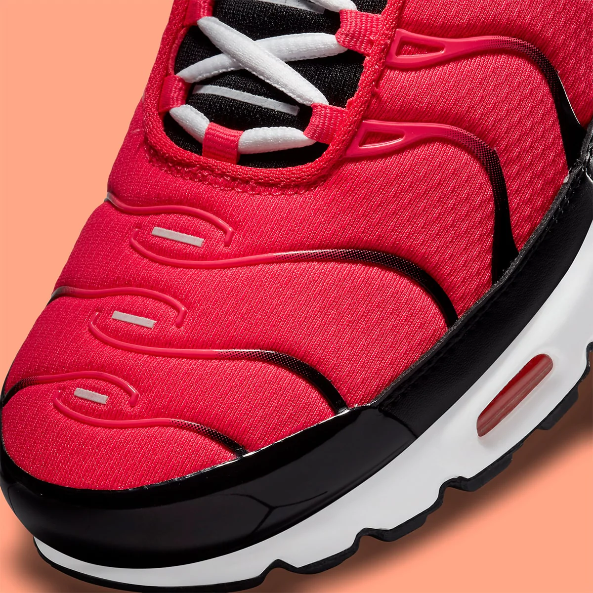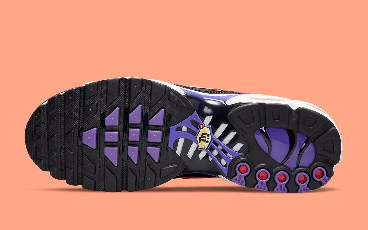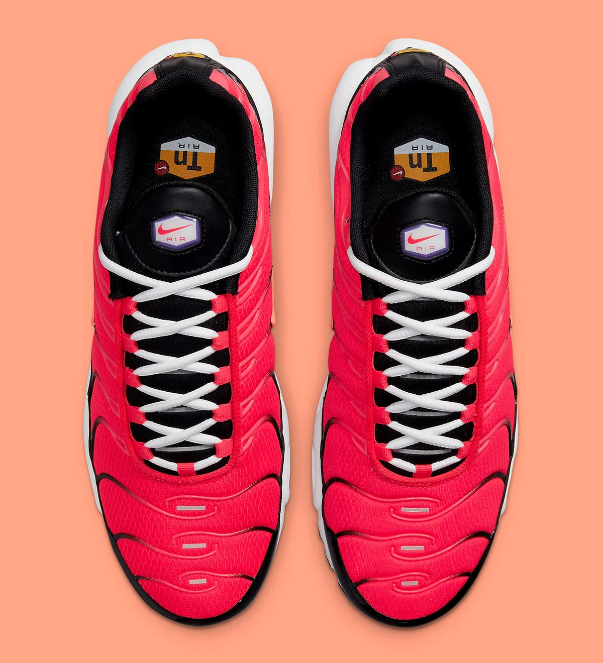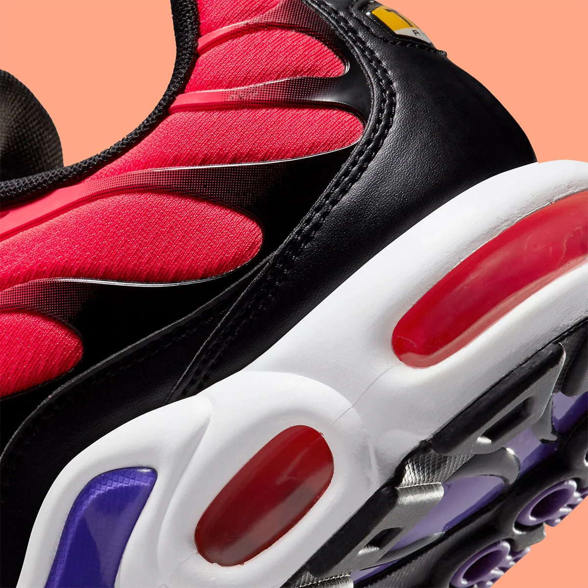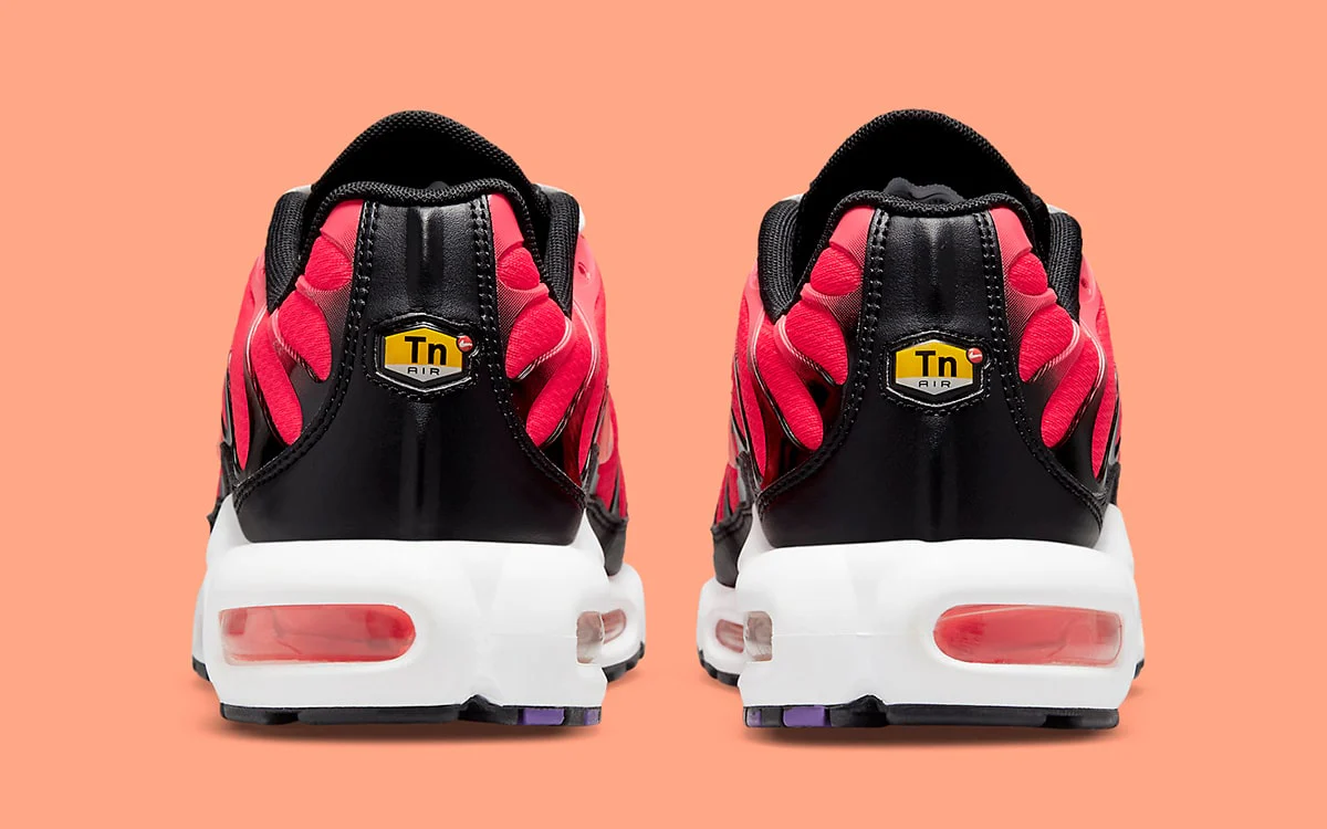 Les cages TPU noires, fluides et agressives, renforcent la signature visuelle de la TN tout en accentuant la montée en intensité du rouge. Le talon sculpté, imposant et technique, apporte stabilité et caractère, tandis que les accents rouges sur la semelle et les détails branding soulignent l’expressivité de ce colorway.
