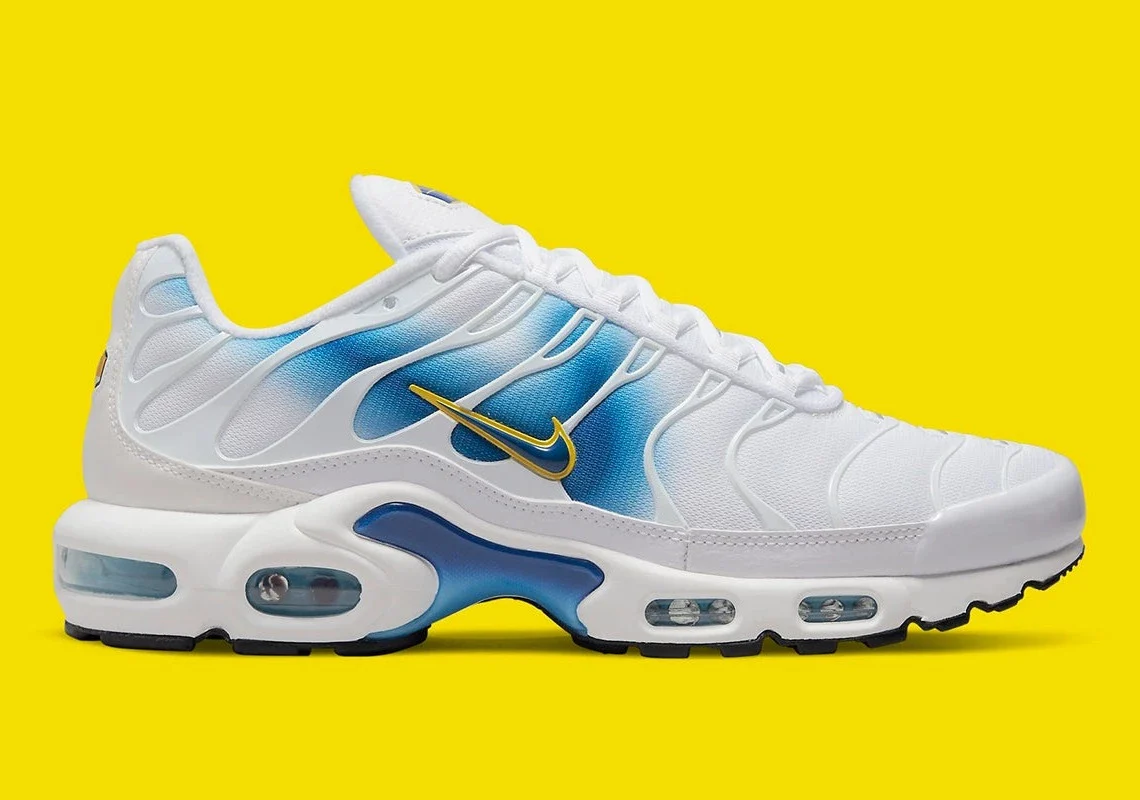Les cages TPU blanches, discrètes et structurantes, laissent toute la place à l’expression colorée du Swoosh. Les accents bleu royal sur les œillets, le mini-branding et la semelle viennent renforcer ce contraste moderne et tonique. Le talon sculpté, signature de la Air Max Plus, s’habille lui aussi de touches bleues travaillées pour renforcer l’effet graffiti.