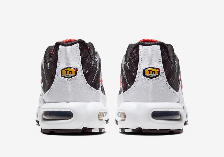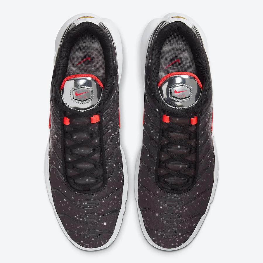 Les cages TPU noires se fondent dans le décor spatial, tandis que le talon sculpté adopte une finition métallisée rappelant les coques technologiques des vaisseaux futuristes. Des détails tels que les accents réfléchissants, le logo Tn Air contrasté ou encore les nuances stellaires subtilement réparties renforcent l’impact visuel du modèle.