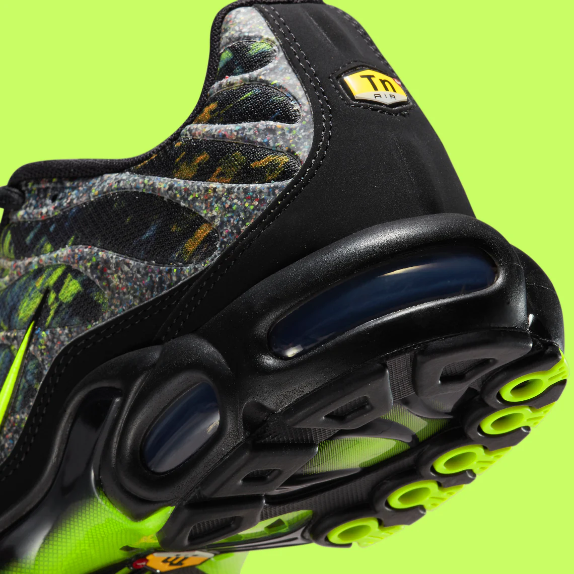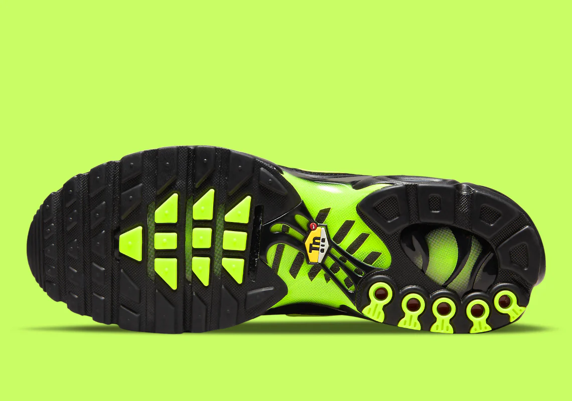 Les cages TPU partiellement recyclées, ton sur ton, apportent structure et maintien sans compromettre l’esthétique sombre du modèle. Le talon sculpté, emblématique de la TN, adopte une finition robuste et subtilement texturée, tandis que les touches Volt sur le branding et la semelle injectent la dose parfaite de modernité électrique.