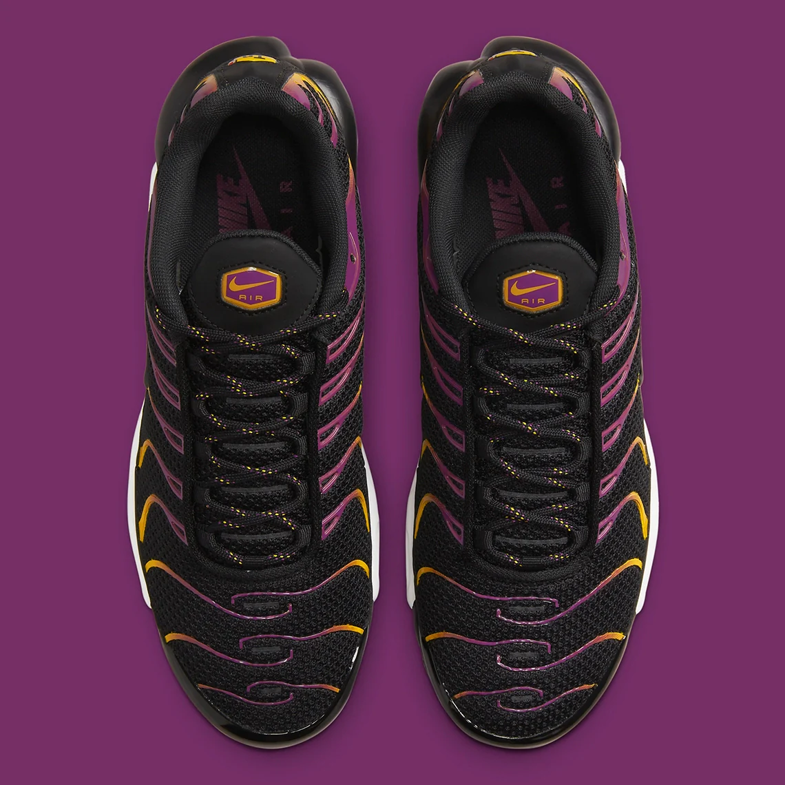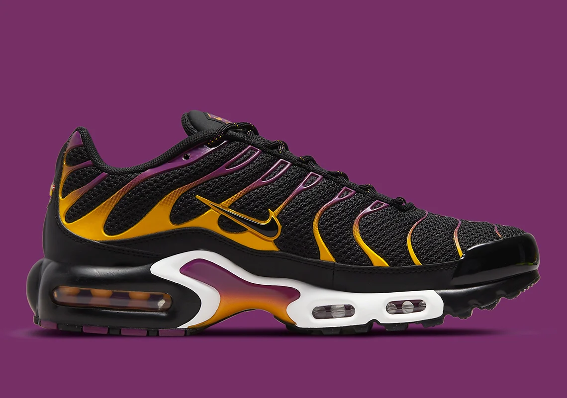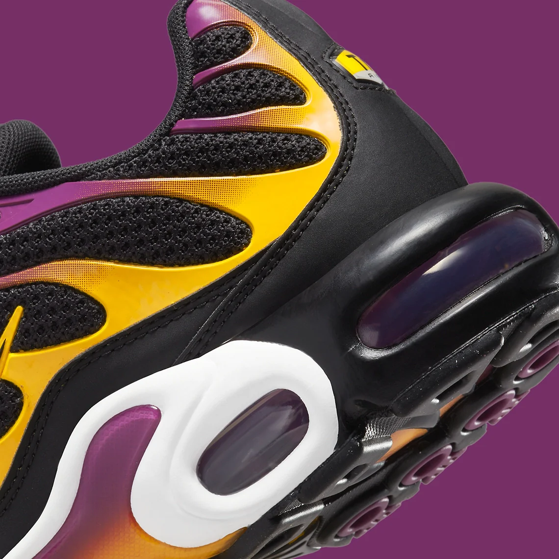 Les touches “Viotech Purple” — violet irisé typique de certaines éditions iconiques Nike — apparaissent sur les détails stratégiques : Swoosh, œillets, logo “Tn Air”, apportant une cadence visuelle riche, presque mystique. Les cages TPU noires, fluides et structurantes, soulignent la silhouette avec force et harmonie. Le talon sculpté, signature de la Air Max Plus 3, renforce le caractère technique du modèle.