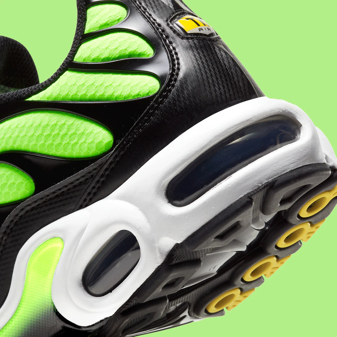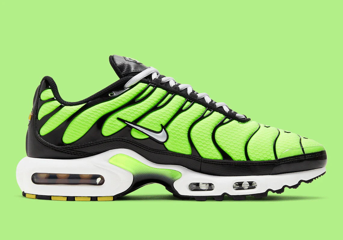 La Nike Air Max Plus Volt (2021) fait revivre l’énergie électrique de la TN dans l’un de ses coloris les plus iconiques : le Volt, un jaune fluorescent intense qui a marqué l’histoire de Nike. Cette version 2021 propose une tige en mesh ultra-respirant habillée d’un dégradé Volt éclatant, parfaitement contrasté par des cages TPU noires qui soulignent les lignes agressives de la silhouette.