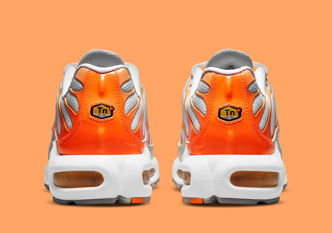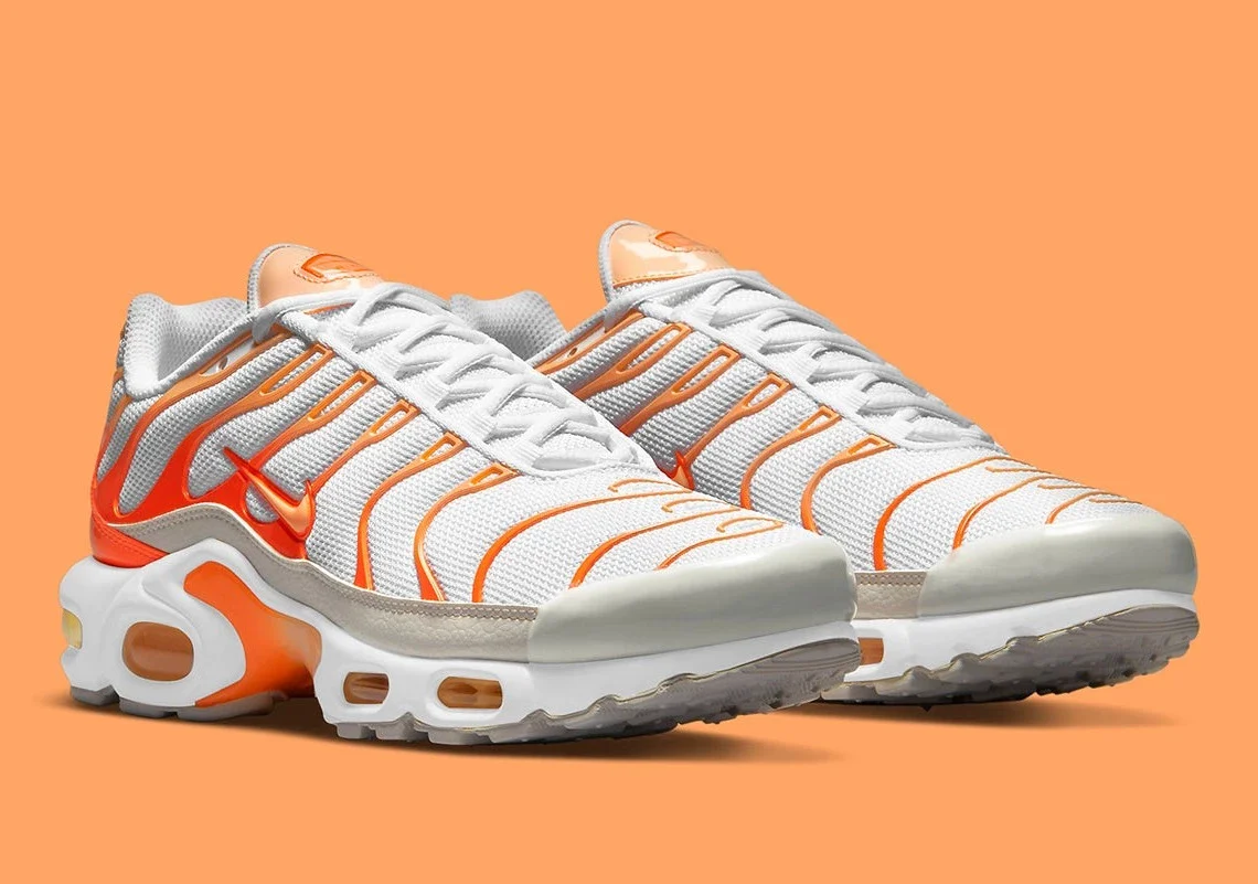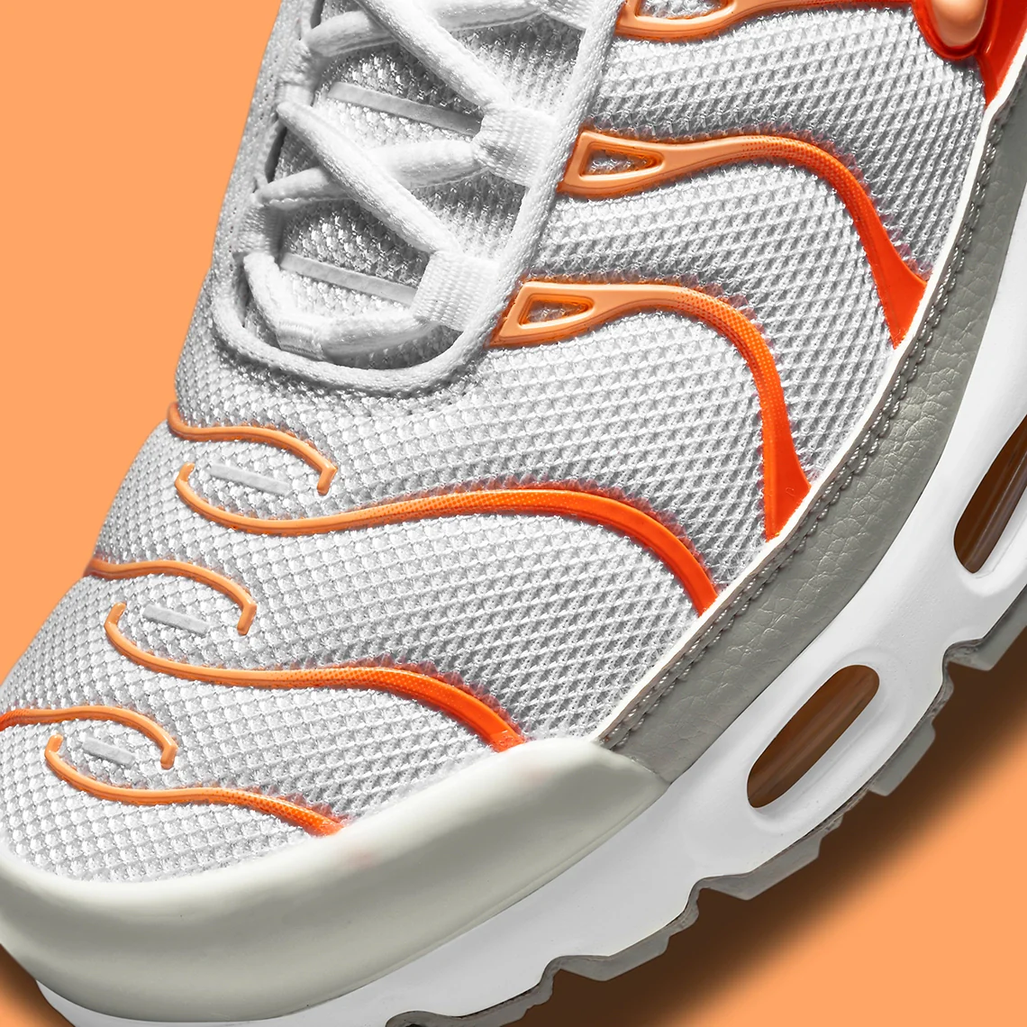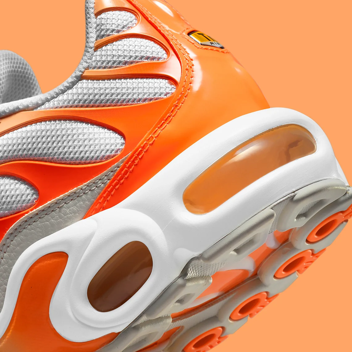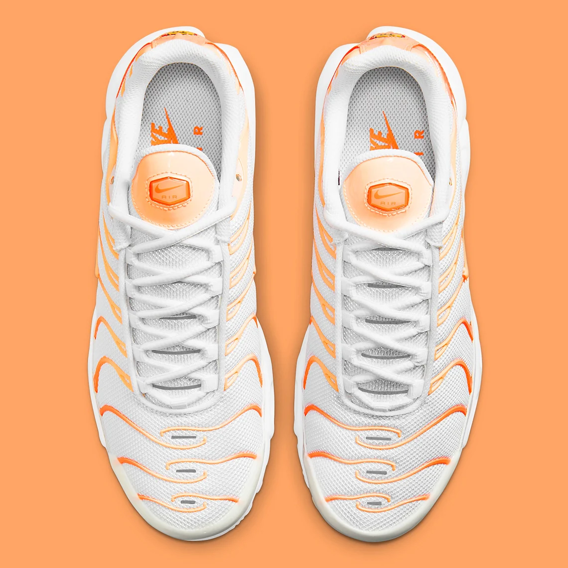 Les cages TPU translucides ou légèrement nacrées se fondent subtilement dans le design, créant un équilibre élégant entre pureté et dynamisme. Le talon sculpté, signature de la Air Max Plus, adopte lui aussi des nuances orangées délicatement injectées pour renforcer l’harmonie globale du modèle.