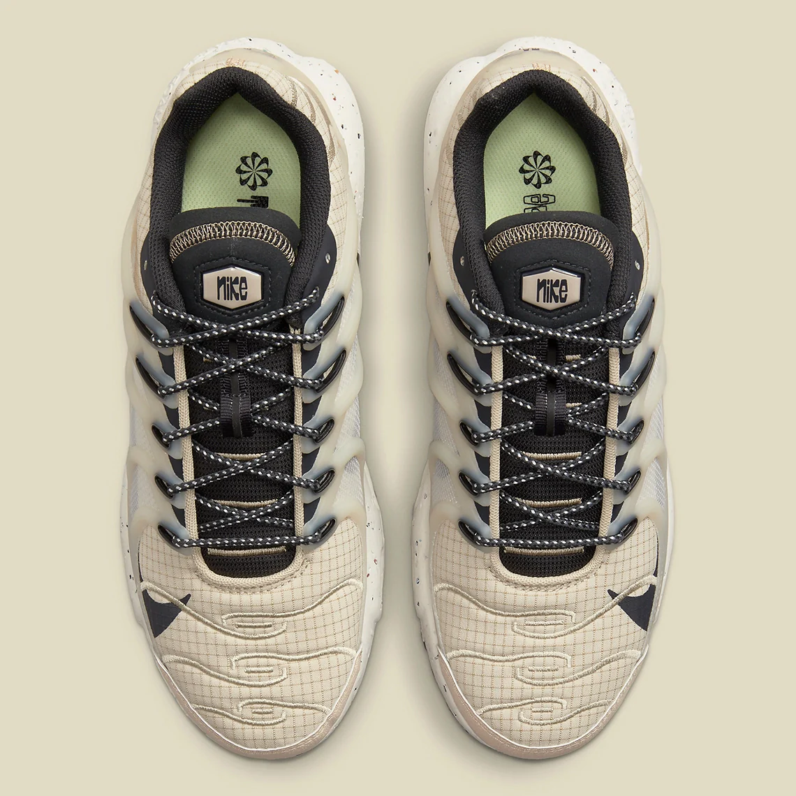 La Nike Air Max Terrascape Plus Rattan réinvente l’iconique Air Max Plus avec une approche éco-responsable et futuriste, sans renier son héritage street. Sa tige en mesh recyclé “Rattan” beige sable est renforcée par des cages TPU translucides, offrant une structure légère et moderne. Des accents crème et kaki viennent enrichir la palette naturelle, tandis que le design conserve les lignes organiques inspirées du vent et des palmiers propres au modèle original.