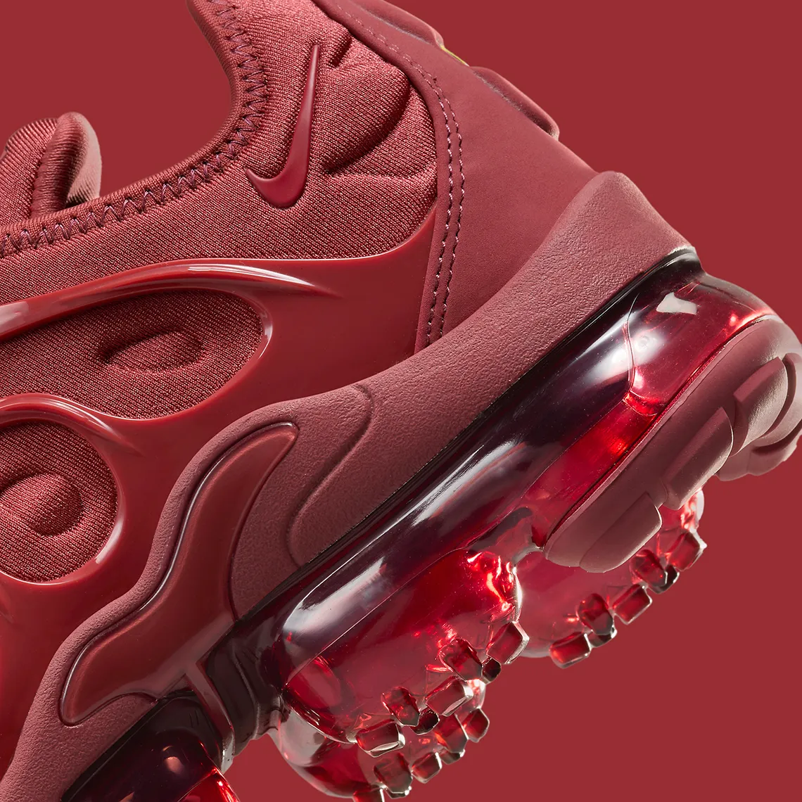Cela semble changer à l’approche de la seconde moitié de 2023, car Nike a enfin dévoilé un tout nouveau coloris du modèle hybride. Pour sa dernière apparition, le VaporMax Plus arrive presque entièrement dans une seule nuance de rouge. Cette couleur est appliquée sur tout, de la base en nylon aux détails en TPU le long de la pointe, du profil et du talon. Et tandis que des détails tels que les lacets, la doublure et les tirettes emboîtent le pas, la semelle à bulles opte pour une teinte beaucoup plus foncée, de type bordeaux.