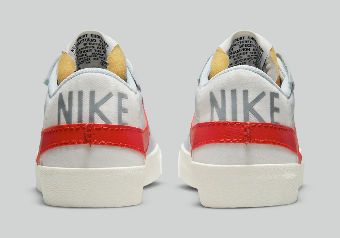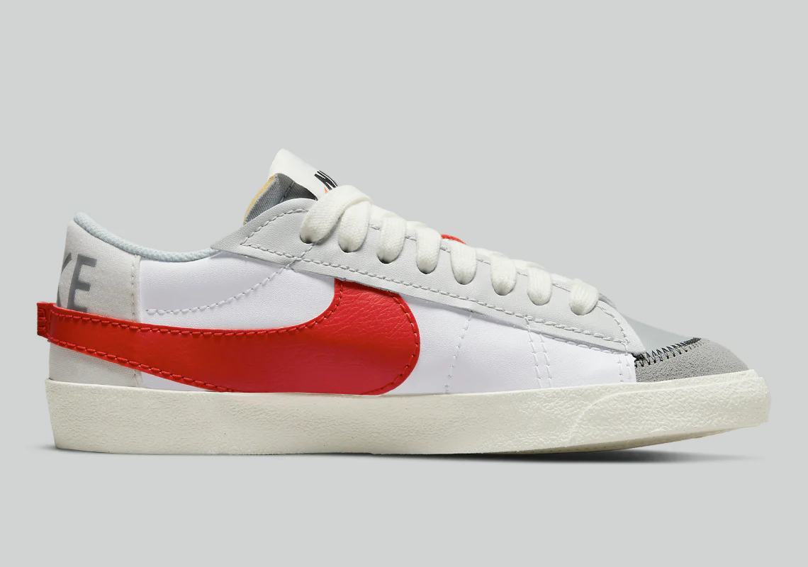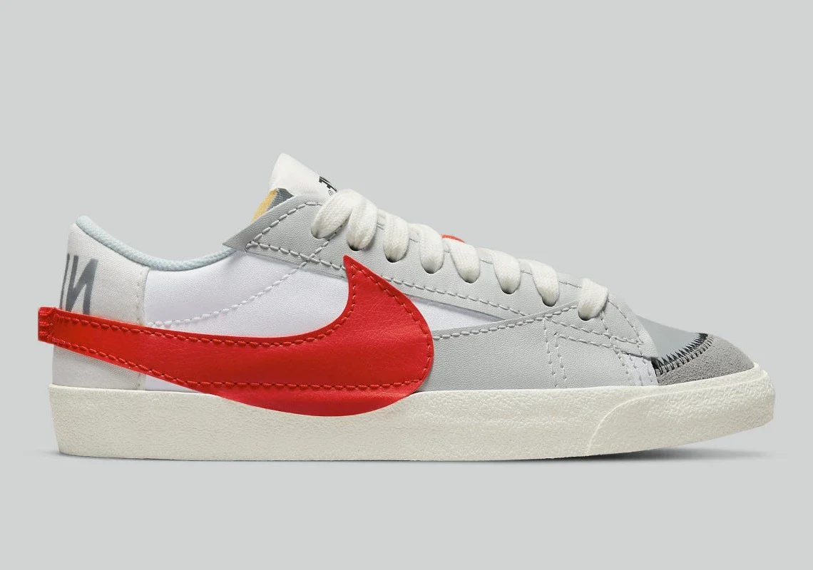 Pour son dernier ensemble, la proposition exagérée et avant-gardiste s’est habillée d’une combinaison de couleurs gris et blanc qui place l’ancien ton sur la majeure partie de la tige en cuir. Les swooshes de profil géant introduisent ensuite une teinte rouge très contrastée dans le mélange, qui complète bien la marque sur l’étiquette de la languette. Des panneaux « incolores » comblent les espaces sur les parois latérales, tandis qu’une couleur blanc cassé recouvre les semelles sous les pieds, rappelant la première époque de la Nike Blazer compte tenu de son esthétique légèrement « vieillie ».