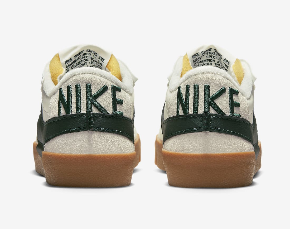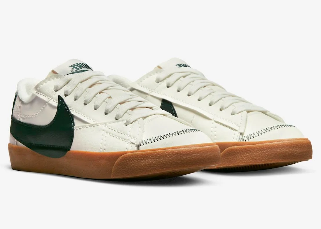 Cette version Jumbo se distingue par sa palette de couleurs simple et efficace, mettant en valeur une empeigne en cuir blanc cassé. Les superpositions en cuir ton-sur-ton dominent l’ensemble, à l’exception du talon qui arbore un luxueux daim gris. Des touches de vert anglais viennent rehausser le design, notamment sur le swoosh oversize, les marquages de la languette et du talon, ainsi que sur certaines surpiqûres. Pour parfaire ce modèle, une semelle gomme très appréciée ajoute une touche finale de qualité à l’ensemble.
