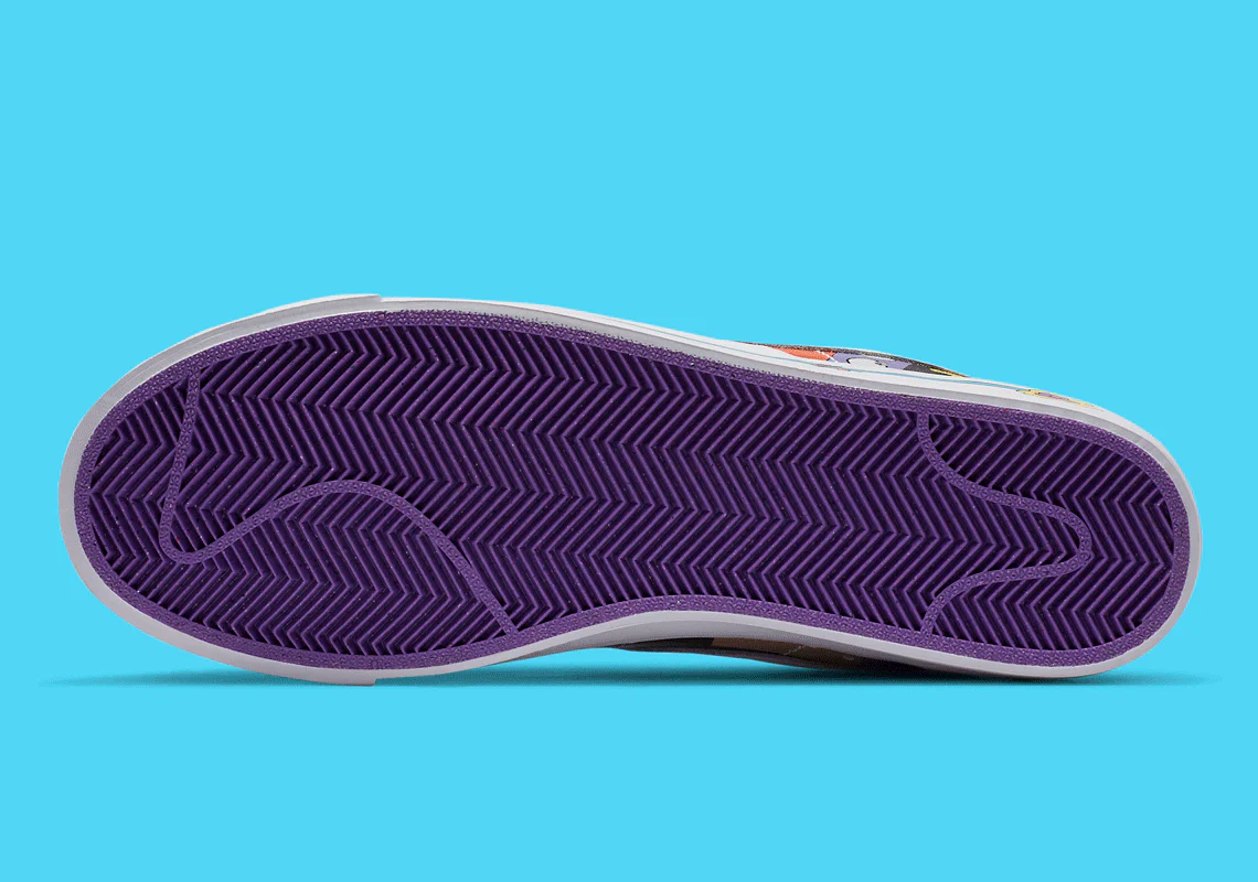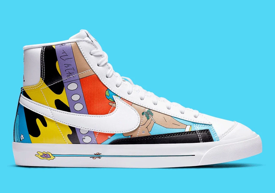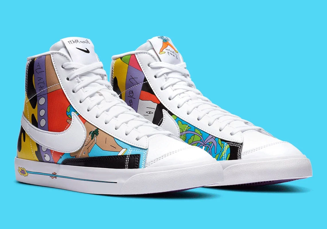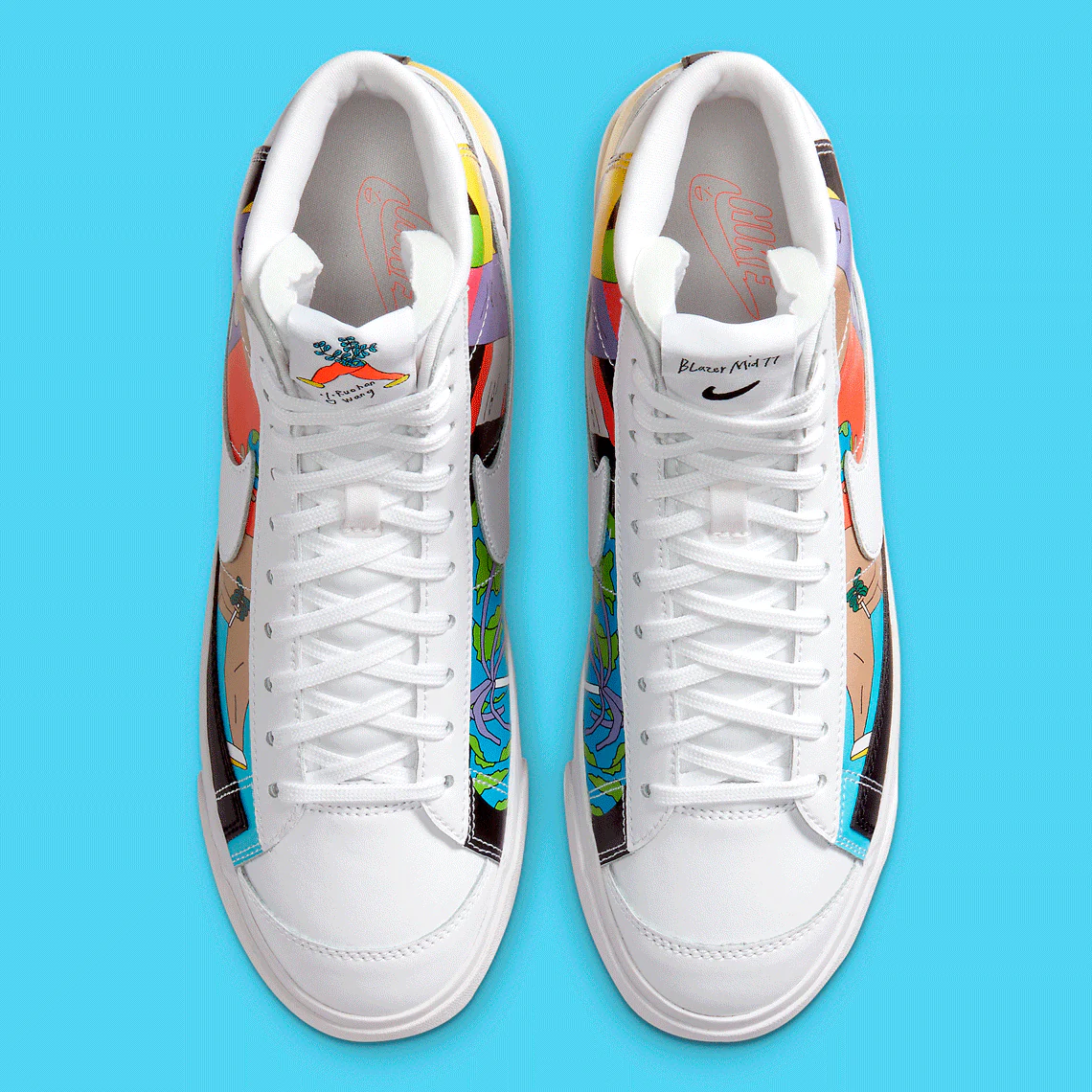 L’utilisation de la couleur par Wang est très répandue dans son travail artistique, et cela est également vrai ici. Les deux côtés de la partie supérieure du cuir du Blazer Mid Flyleather présentent des graphiques abstraits imprimés sur le matériau en cuir recyclé mentionné ci-dessus. Les teintes de violet, jaune, orange, bleu et vert utilisées dans l’imagerie contribuent à transformer cette chaussure en une œuvre d’art. Un Swoosh en cuir blanc apparaît de chaque côté. Le bout, les oeillets et le talon sont finis en cuir blanc. Des détails dessinés à la main par Wang se trouvent sur la langue. Date de sortie : 24 septembre 2020.