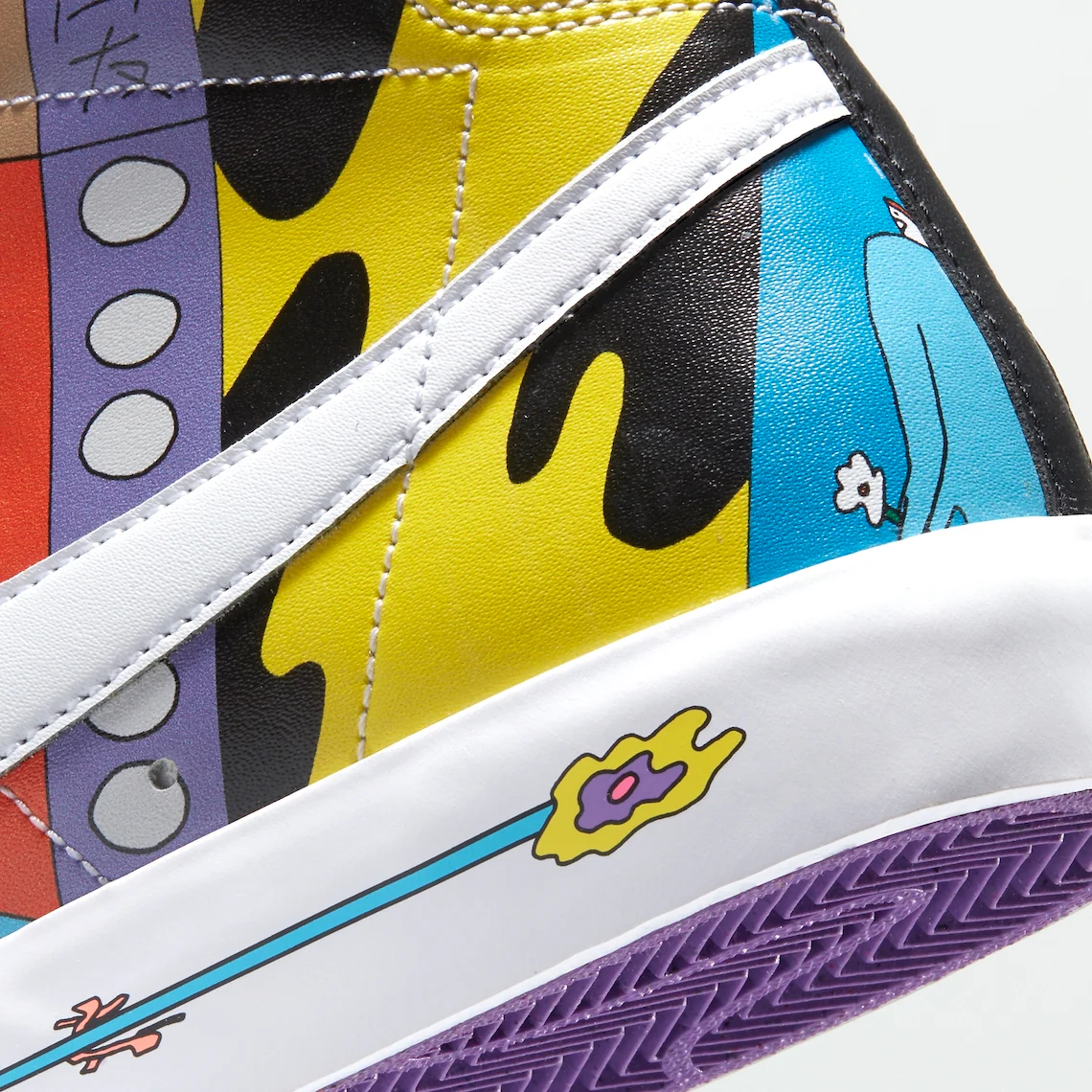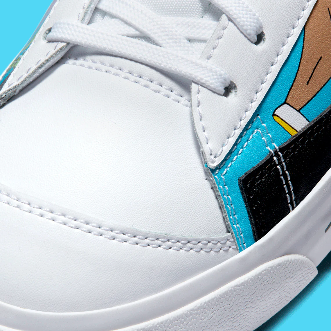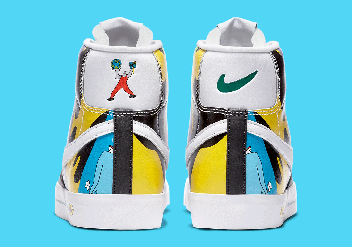 L’utilisation de la couleur par Wang est très répandue dans son travail artistique, et cela est également vrai ici. Les deux côtés de la partie supérieure du cuir du Blazer Mid Flyleather présentent des graphiques abstraits imprimés sur le matériau en cuir recyclé mentionné ci-dessus. Les teintes de violet, jaune, orange, bleu et vert utilisées dans l’imagerie contribuent à transformer cette chaussure en une œuvre d’art. Un Swoosh en cuir blanc apparaît de chaque côté. Le bout, les oeillets et le talon sont finis en cuir blanc. Des détails dessinés à la main par Wang se trouvent sur la langue. Date de sortie : 24 septembre 2020.