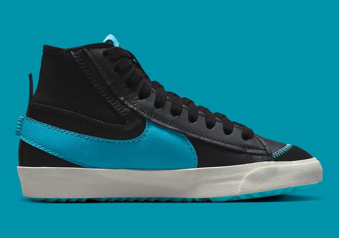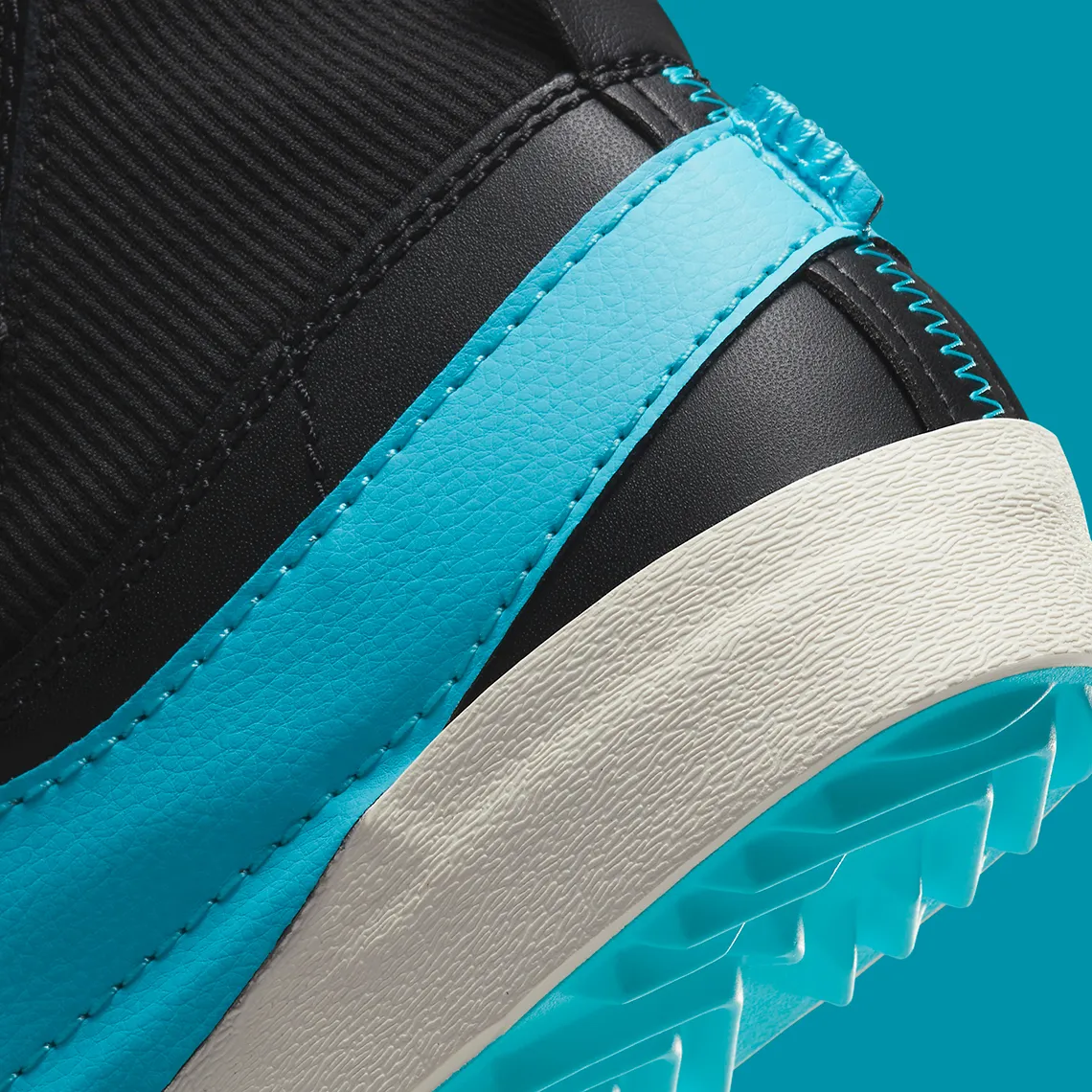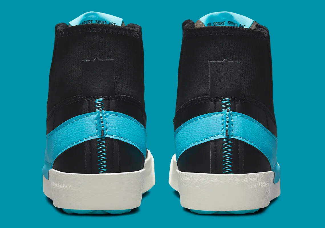 La base en cuir blanc prototypique du modèle est inversée, construisant les panneaux supérieurs et les lacets entièrement noirs qui dominent la construction surélevée au-dessus d’une semelle intercalaire de couleur blanc cassé. La seule touche de couleur est un ton « Aqua » vibrant qui reprend les mêmes caractéristiques que les versions précédentes, notamment les Swooshes de connexion, la languette supérieure de la languette, les coutures accentuées et l’esthétique avant-gardiste de la semelle extérieure sous-jacente.