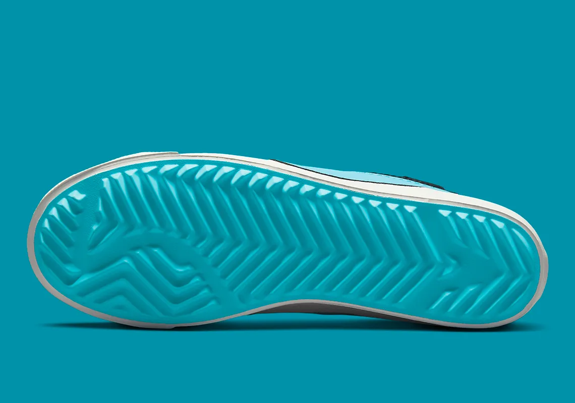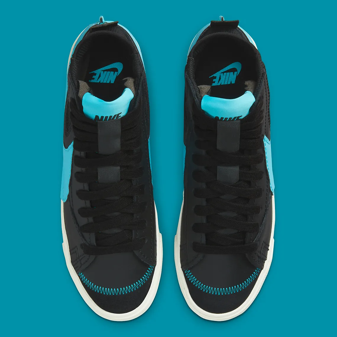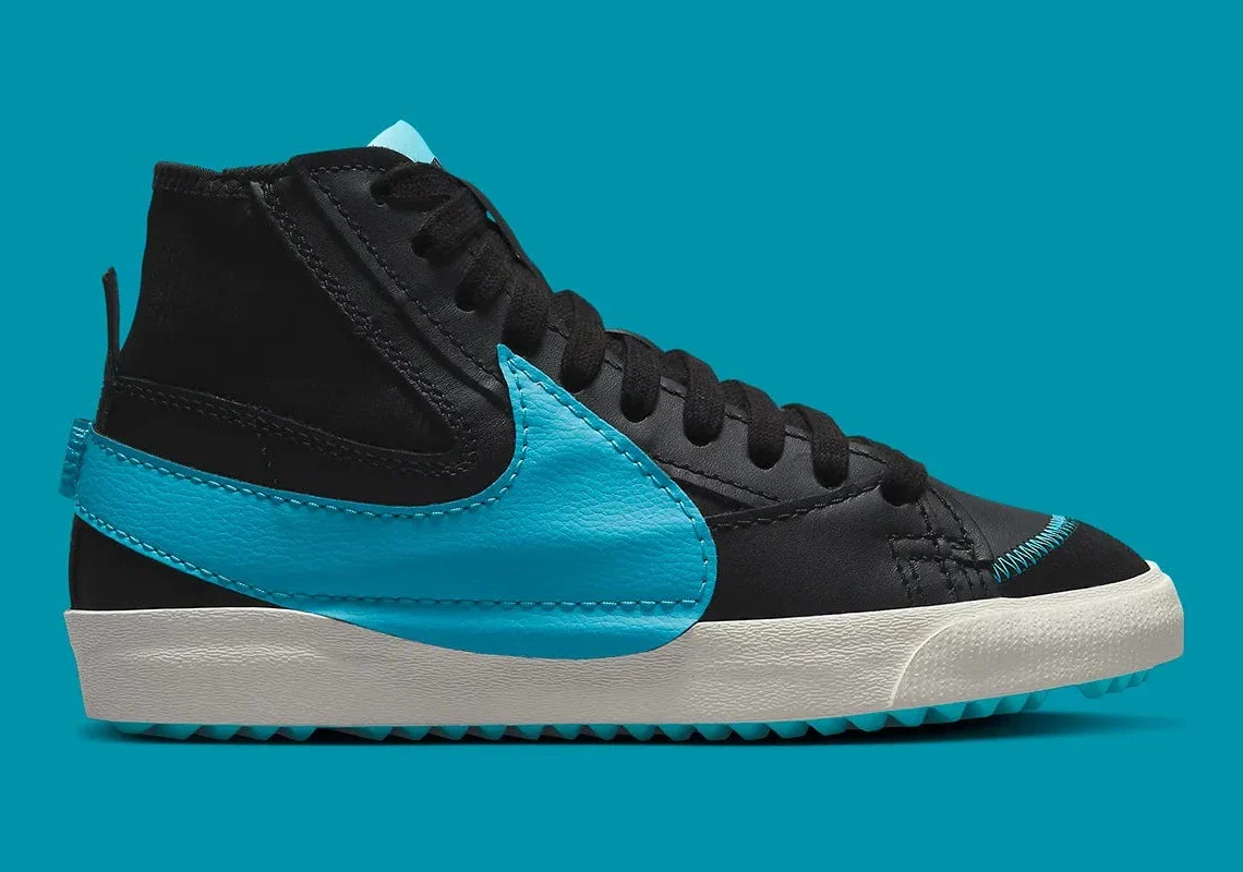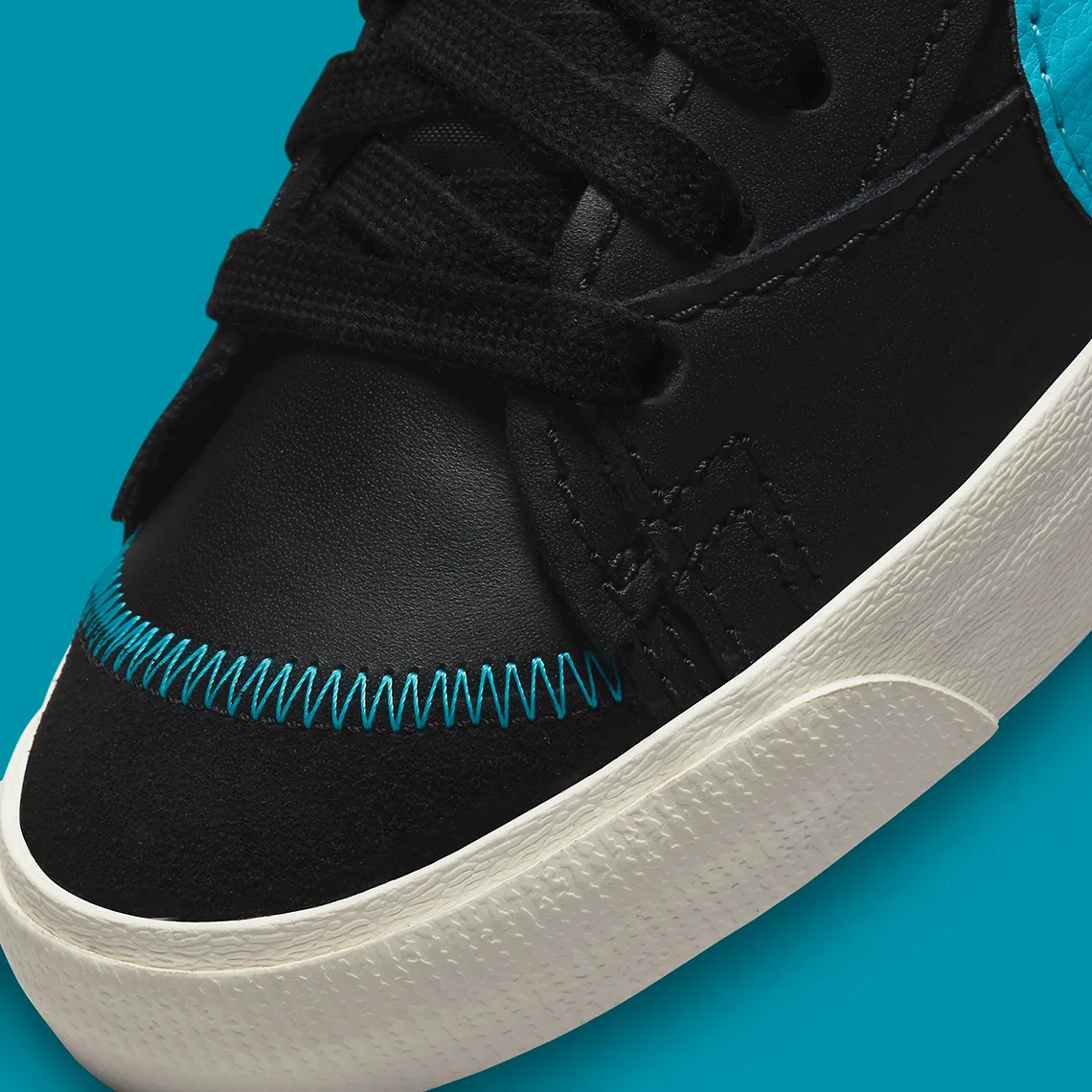 La base en cuir blanc prototypique du modèle est inversée, construisant les panneaux supérieurs et les lacets entièrement noirs qui dominent la construction surélevée au-dessus d’une semelle intercalaire de couleur blanc cassé. La seule touche de couleur est un ton « Aqua » vibrant qui reprend les mêmes caractéristiques que les versions précédentes, notamment les Swooshes de connexion, la languette supérieure de la languette, les coutures accentuées et l’esthétique avant-gardiste de la semelle extérieure sous-jacente.