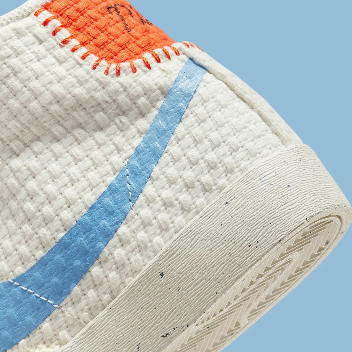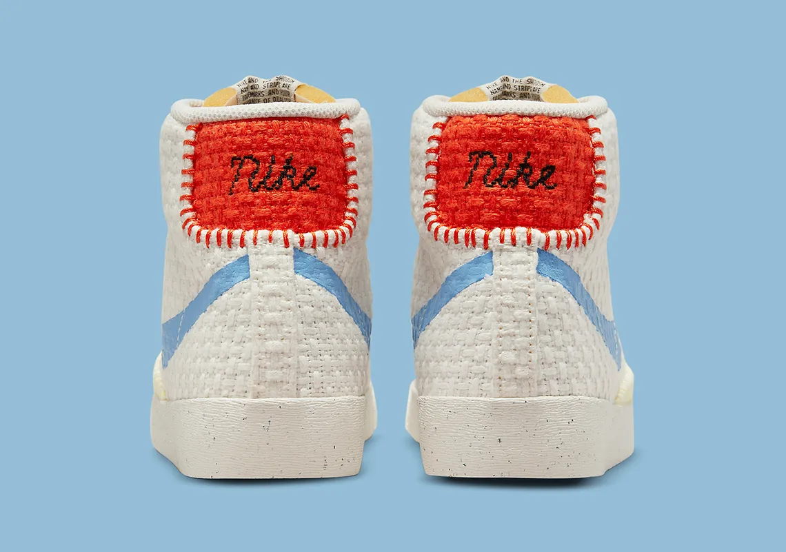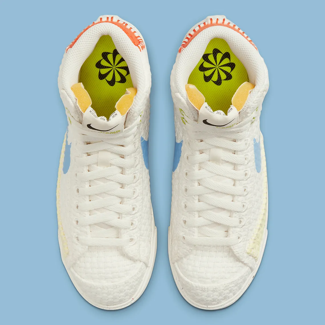 Bien que la tige soit tissée presque à chaque endroit, la semelle ne l’est pas. Au lieu de cela, il est apparemment fabriqué à partir de matériaux durables, comme l’indiquent les taches noires éparpillées au hasard sur la surface. Ci-dessus, les panneaux sont enfilés de différentes couleurs : le Swoosh opte pour un bleu vif, la languette du talon un orange rougeâtre et le renfort avant un jaune pastel. Quant aux accessoires adjacents (tels que les renforts pour les yeux, la base, l’embout, etc.) chacun est fini dans un blanc neutre, tout comme la doublure, la languette et les lacets.