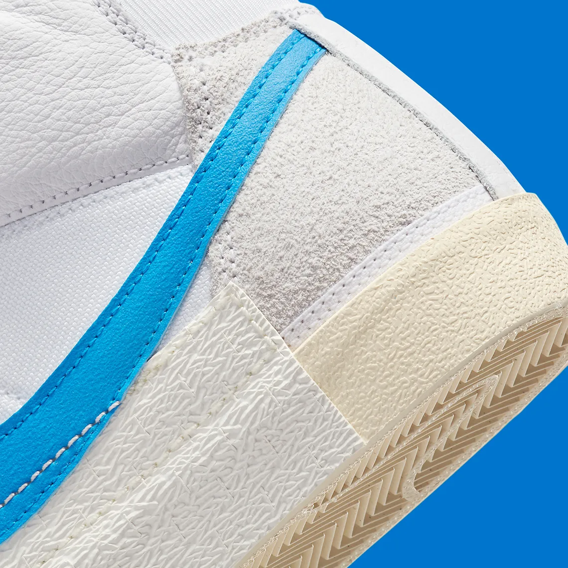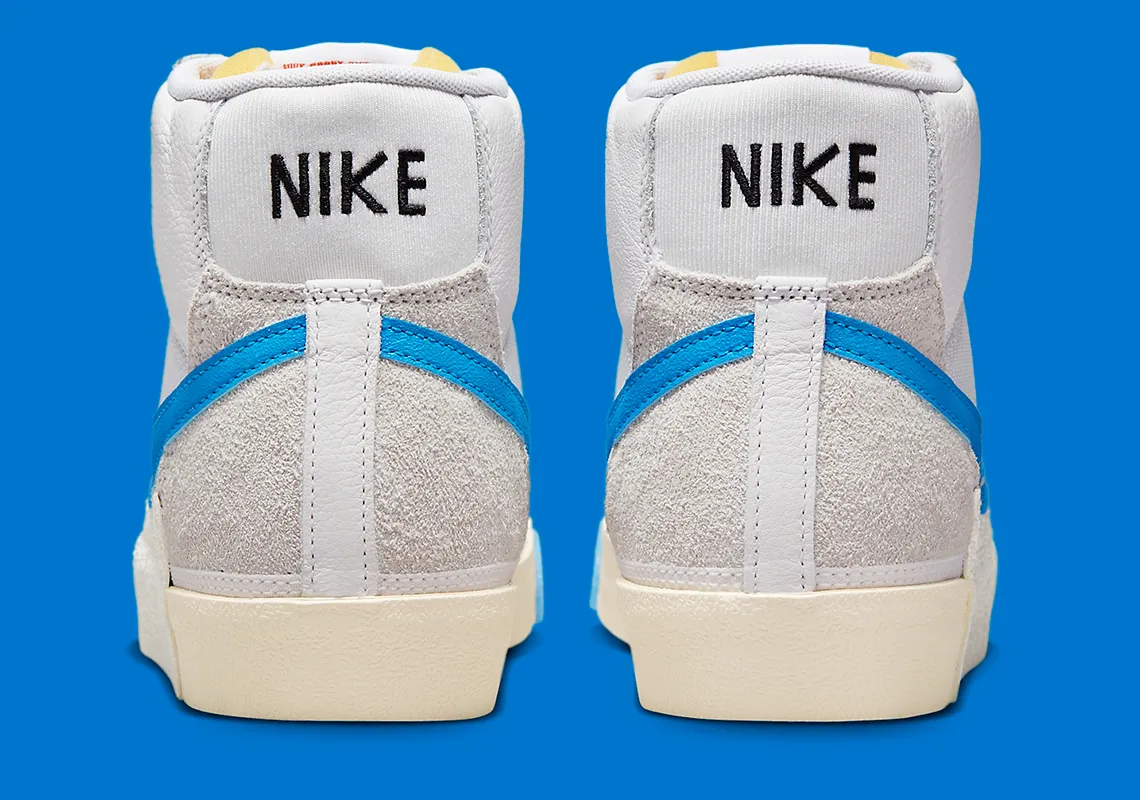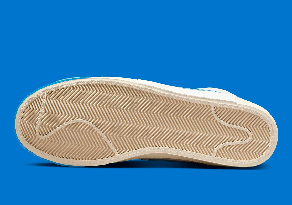 Avec le Blazer Mid ’77, une approche inspirée du patchwork s’impose avec l’avant-pied et le col de la cheville dans un cuir blanc impeccable tandis que le milieu du pied utilise un panneau en tricot respirant. Les garde-boue, les quartiers et les contreforts en daim lavé offrent un matériau supplémentaire au creuset portant un ton gris clair tandis qu’un accent « plage » remplit la construction de la languette. Des touches titulaires et sélectives de « Photo Blue » recouvrent les Swooshes et l’embout doublé tandis qu’un « Team Red » opposé brille sur les étiquettes de languette et les semelles intérieures en nylon. Pendant ce temps, sous le pied, un mélange des couleurs susmentionnées est réintroduit dans la semelle intercalaire en caoutchouc texturé pour une conclusion collaborative.