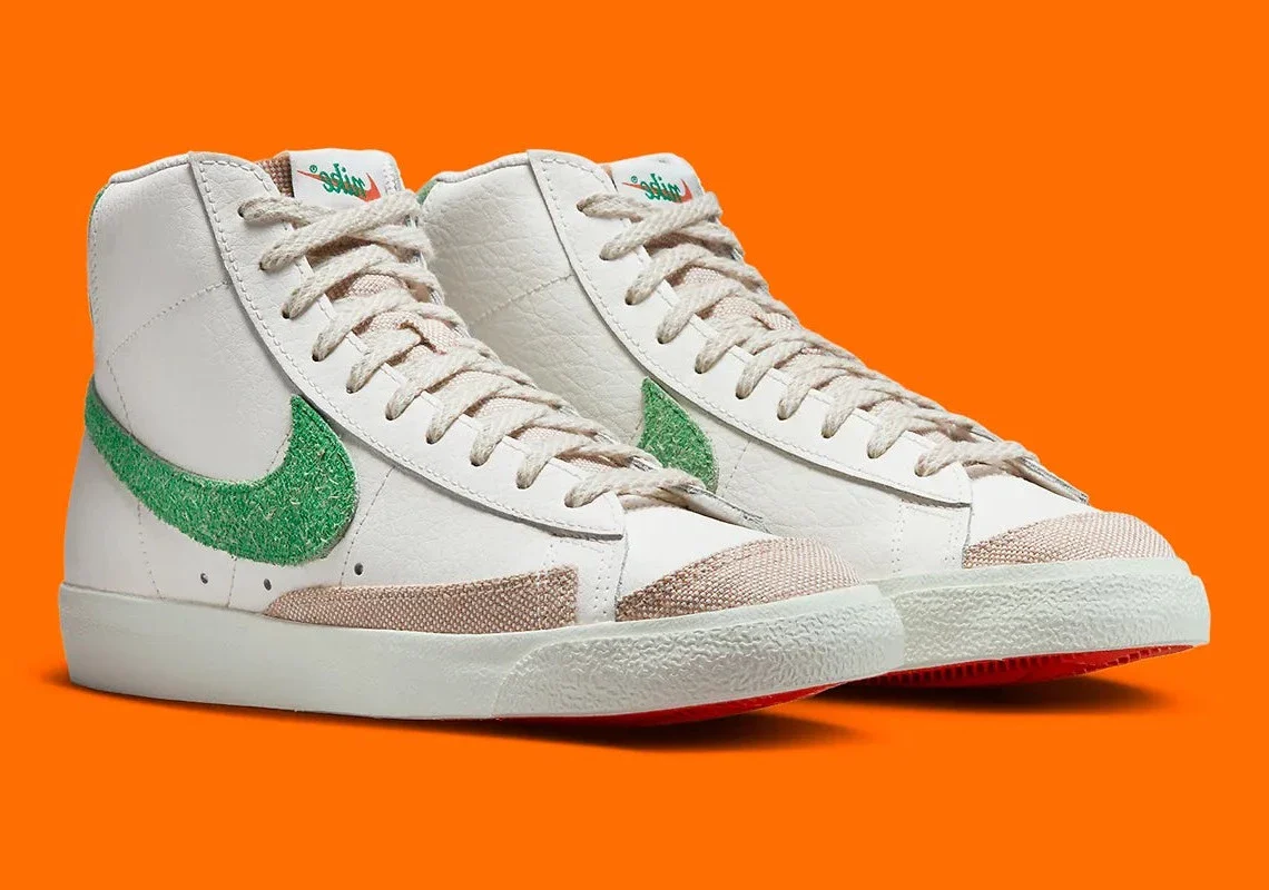 À mesure que 2023 pouces se rapprochent, le design mi-montant a émergé dans un ensemble blanc classique accompagné d’un renfort rappelant le chanvre autour de la pointe, d’un daim poilu au niveau des swooshes du profil et d’un matériau semblable à une toile au niveau de la colonne vertébrale. Les deux derniers composants optent pour un ton vert riche qui fonctionne en tandem avec une touche orange vif sur l’étiquette de la languette et le talon supérieur pour créer une proposition prête pour le printemps. Les semelles intercalaires privilégient un look blanc cassé éprouvé, tandis que la traction à chevrons en dessous se délecte d’une saveur plus d’agrumes.
