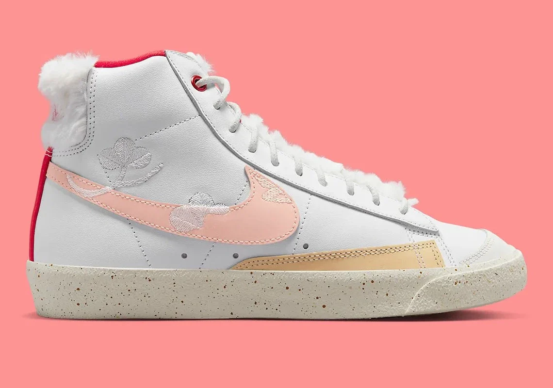 La silhouette inclut un col en fourrure blanche ou à effet « lapin » sur certaines zones, un clin d’œil discret à l’année du lapin. Les broderies florales blanches sur le panneau latéral renforcent l’inspiration festive et artisanale, tandis que la semelle en “Sail” avec des accents dorés ou bruns ajoute une finition élégante.