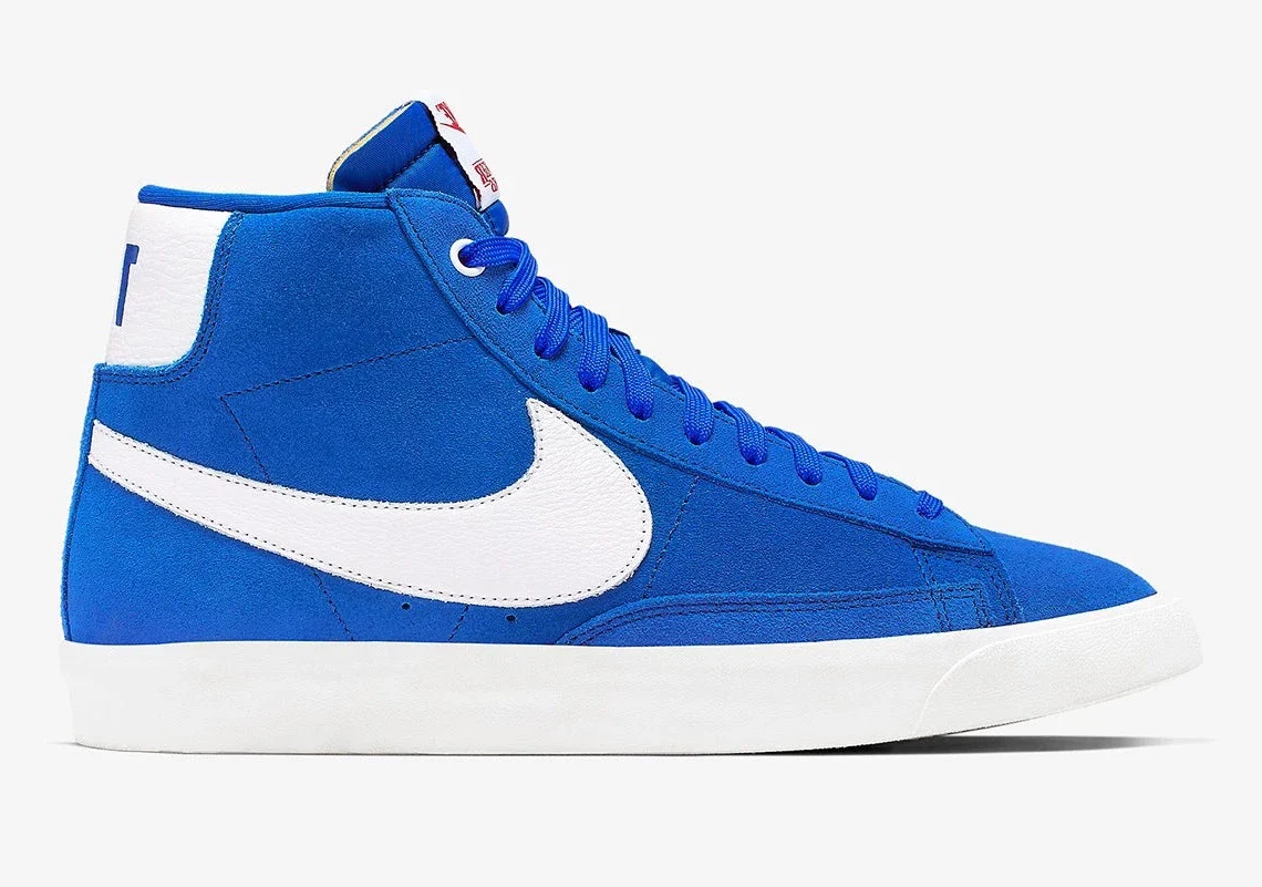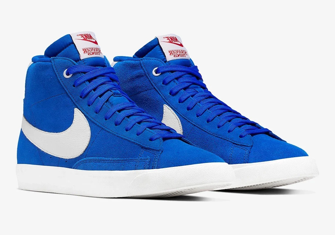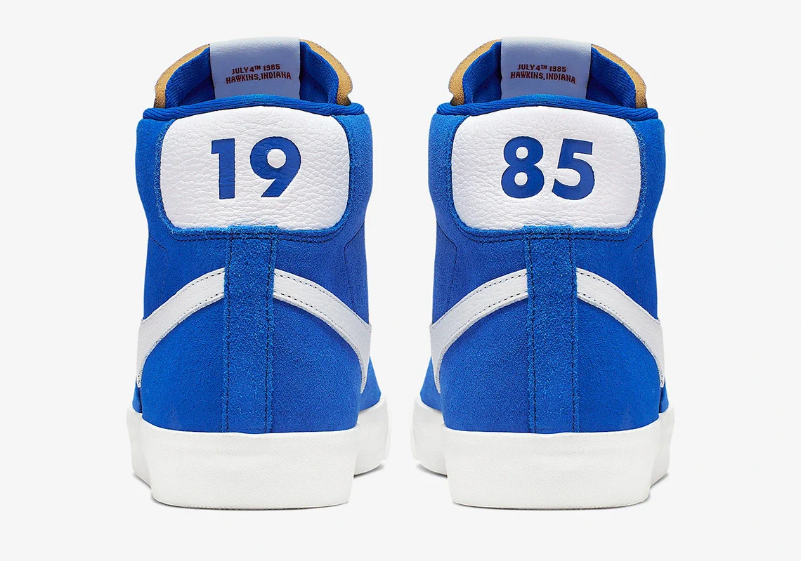 Stranger Things x Nike Blazer « OG Pack » en bleu fait partie de la collection de Nike célébrant la saison 3 de la série de science-fiction à succès. Ce Blazer fait partie du « OG Pack », dont les couleurs sont similaires à celles des versions originales du Blazer, de Cortez et de Tailwind 79 de la collection. Il est doté d’une tige en daim bleu, de Swooshes en cuir blanc et de panneaux aux chevilles, ces derniers étant estampillés « 19 » et « 85 » sur les talons opposés pour représenter l’année où se déroule la saison 3 de Stranger Things.