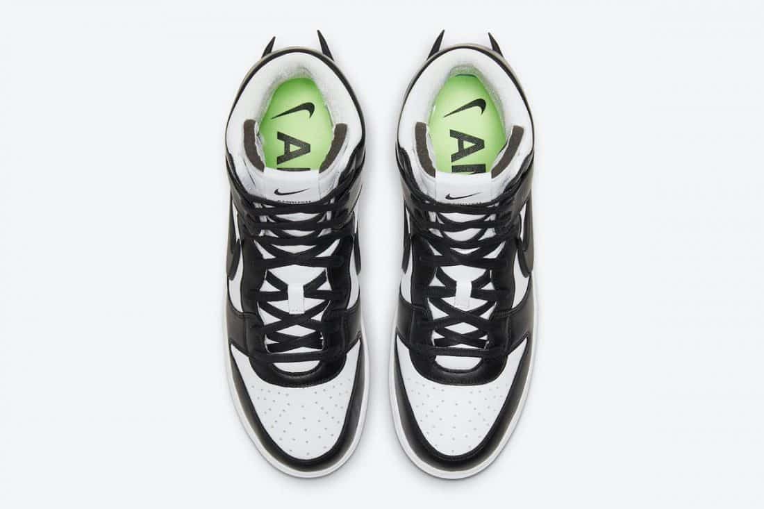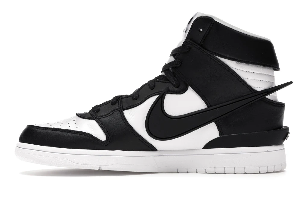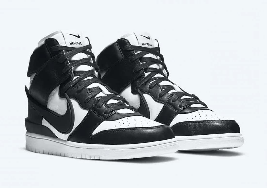 La AMBUSH x Dunk High « Black » est sorti dans le cadre d’une collaboration avec le label de mode de Tokyo. D’un look classique bicolore, la tige de la chaussure est en cuir et comporte des détails exagérés. La caractéristique la plus marquante est le Swoosh allongé et surdimensionné qui dépasse le talon, tandis que les perforations sur la boîte d’orteil assurent la respirabilité. Le compteur de talons TPU comprend la marque AMBUSH, ainsi que la languette, tandis qu’une semelle en caoutchouc blanc fixe la structure.