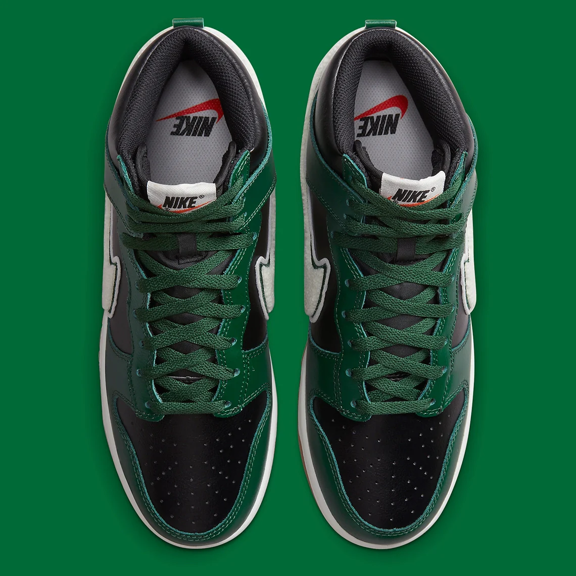 La Nike Dunk High Chenille Swoosh Black Green revisite l’emblématique silhouette Dunk dans une version rétro et texturée, pensée pour mettre en valeur le motif « chenille » sur le Swoosh et une palette de couleurs inspirée des terrains de basket vintage. Sa tige en cuir Noir profond et lisse crée une base élégante et sobre, tandis que les empiècements en vert forêt (Tourmaline/Green) viennent dynamiser le design tout en restant raffinés.