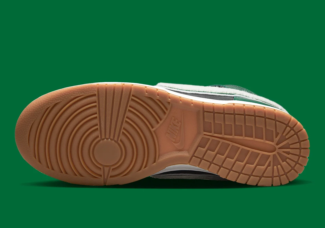 Le détail signature de cette version : le Swoosh en matière chenille verte, texturé, sculpté en relief et offrant une sensation visuelle et tactile forte — un clin d’œil direct aux uniformes rétro et aux finitions « letterman ». Les surpiqûres blanches contrastées, la semelle intermédiaire blanche et la semelle extérieure verte donnent un rendu équilibré et harmonieux. Sous le pied, la semelle classique de la Dunk assure une adhérence fiable et un amorti stable pour un usage quotidien ou lifestyle. Une édition premium, riche en détails et en textures, parfaite pour ceux qui aiment les sneakers aux finitions uniques et à l’esprit vintage.