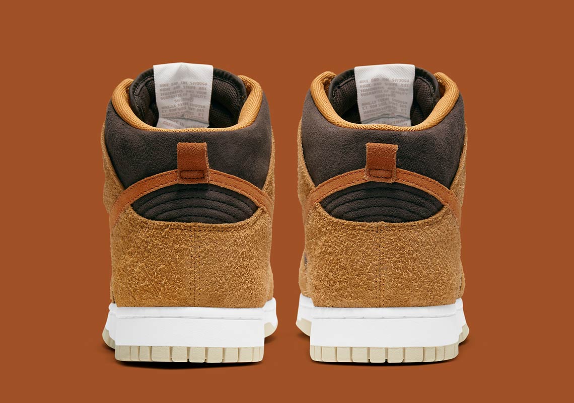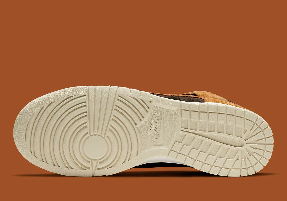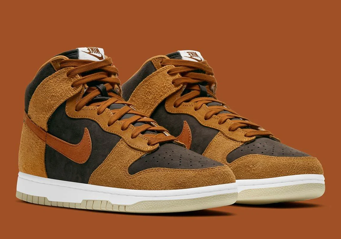 La Nike Dunk est réapparue d’une relative obscurité pour attirer à nouveau l’attention des collectionneurs de baskets en raison d’un nombre impressionnant de collaborations en édition limitée et de coloris rétro de retour. Quant au design du «Dark Russet», les superpositions en daim brun orangé poilu sur l’avant-pied, les œillets, le col et le talon du modèle contrastent avec la base en daim brossé noir. Une nuance plus foncée de daim marron peut être trouvée sur la marque Swoosh de chaque côté et sur la petite languette sur le talon. Nike superpose des lacets marron sur la languette en mesh noir et ajoute une semelle intermédiaire pour un look intemporel. Sous les pieds, une semelle extérieure beige complète le look du « Dark Russet ». Date de sortie : 5 mars 2021.