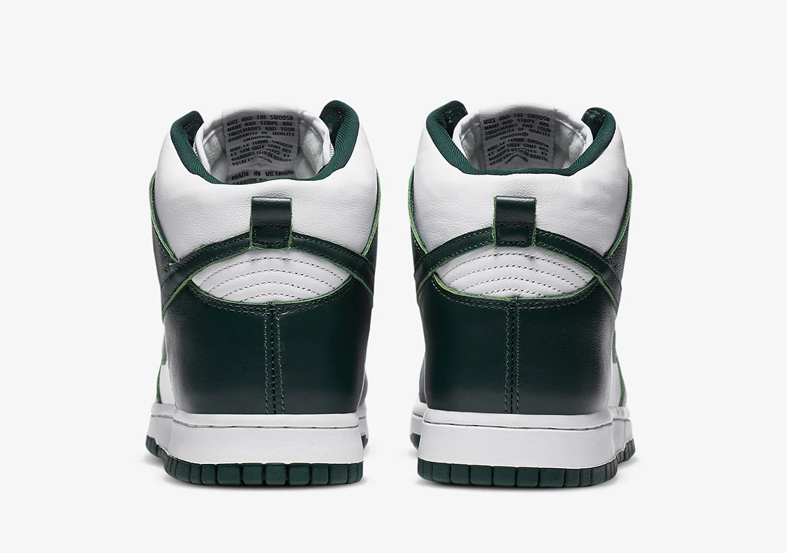 La Nike Dunk High « Spartan Green » utilise les couleurs de l’uniforme d’équipe des Spartans de l’État du Michigan sur la silhouette toujours aussi populaire du Dunk. Cette sortie à l’automne 2020 est la suite du coloriage « Spartan Green » qui a été initialement publié sur la Nike Dunk Low en 2008. Également inspiré par le « Be True to Your School Pack » de 1985, ce coloris « Spartan Green » sur le haut Dunk est sans aucun doute un classique.