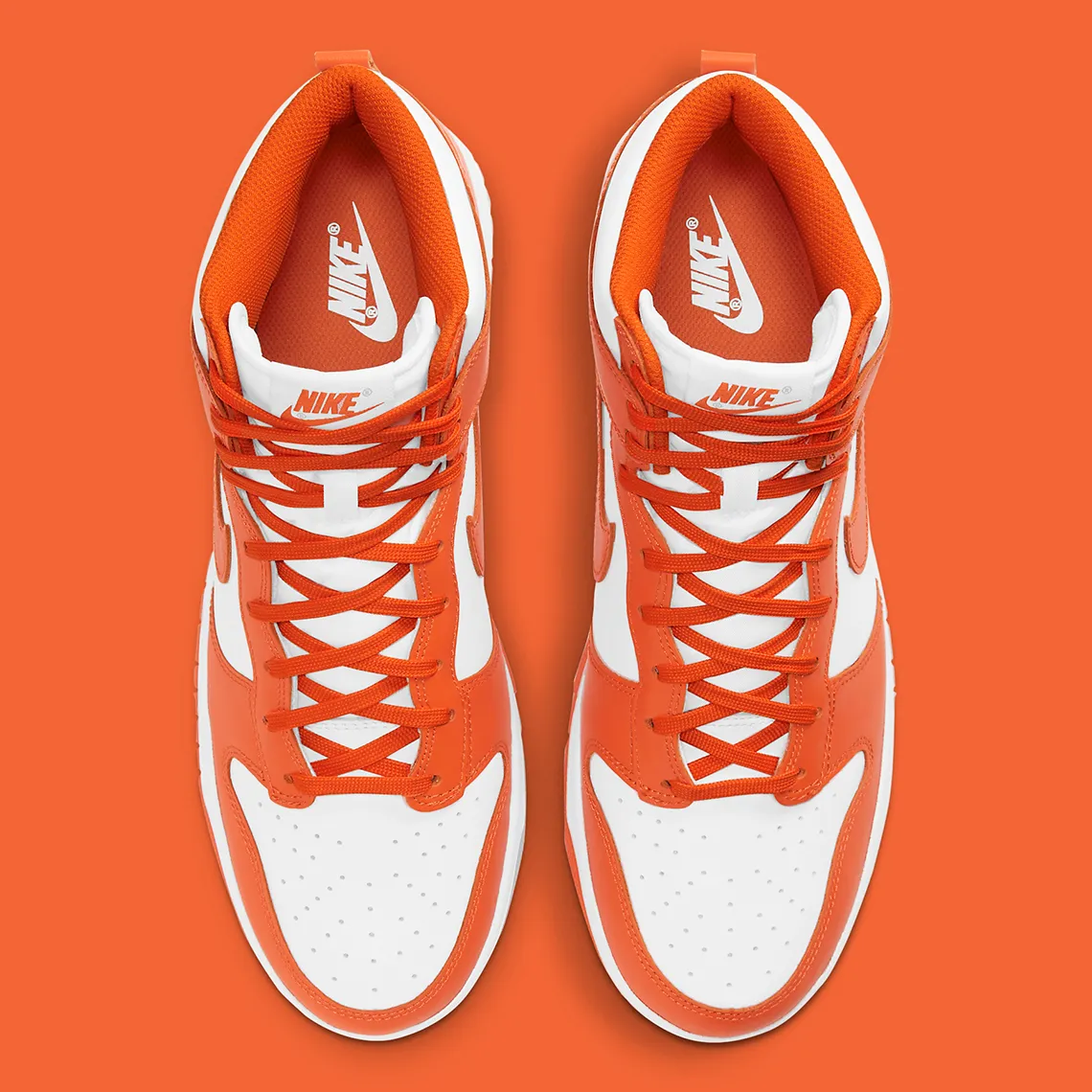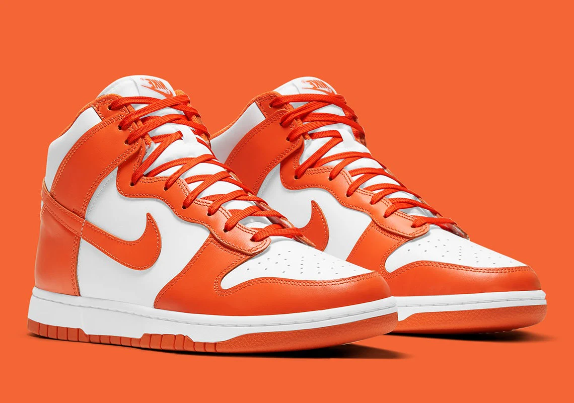 Bien que les couleurs « Syracuse » aient fait leur apparition au début de l’année dernière, ce n’est que maintenant qu’elles connaissent un retour fidèle à l’original. Présenté une fois de plus sur la Dunk High, l’orange vif brille en habillant toutes les superpositions de cuir. Les lacets, la doublure et la bande de roulement emboîtent le pas, tandis que la base sous-jacente, la languette et la semelle intermédiaire contrastent dans leur utilisation de nuances blanches neutres et immaculées.