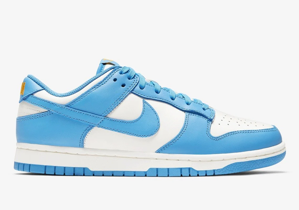 La Nike Dunk Low « Coast » de la silhouette basse durable qui a été lancée par Nike en janvier 2021. Apparemment inspiré par les Bruins de l’UCLA, le coloris « Coast » affiche fièrement la lumière de l’institution d’enseignement supérieur de Los Angeles jeu de couleurs bleu et or dans sa conception. Des superpositions en cuir Coast (ou bleu clair) se trouvent sur l’avant-pied, les œillets, le col et le talon. La même teinte aérée de bleu se trouve sur la marque Swoosh sur le panneau central, sur la languette du talon en cuir avec broderie « Nike » dorée, doublure et lacets de chaussures. Les accents University Gold se trouvent sur l’étiquette de languette en nylon de marque « Nike Air ». Les touches de finition incluent une languette en maille blanche, une semelle intercalaire en caoutchouc blanc et une semelle extérieure Coast. Date de sortie : 14 janvier 2021.